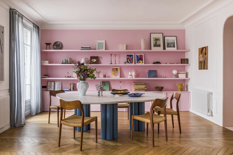 Dzięki usunięciu drzwi prowadzących do salonu i jadalni architektom udało się uzyskać w apartamencie przestronną i jasną przestrzeń. Zamiast tego zaprojektowali zaokrąglone otwory drzwiowe, których ościeżnice zostały pokryte lakierowanym, pudrowym różem.