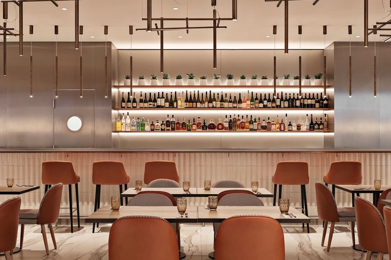 W części restauracyjnej sufit wykończono drewnianymi lamelami, a jego ukoronowaniem jest artystyczna lampa wisząca ze szklanymi dekorami. Uwaga koncentruje się na centralnie położonej "wyspie", wokół której zaaranżowano siedziska.