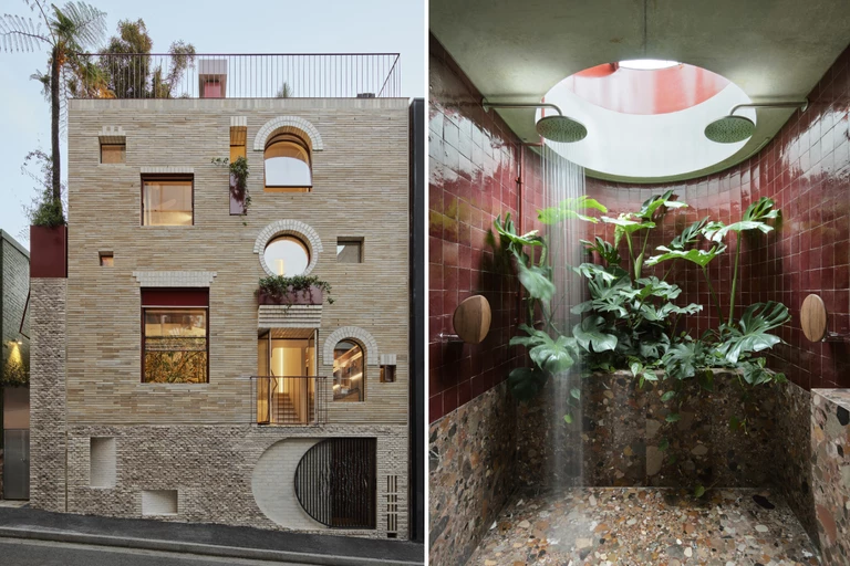 Monochromatyczną ceglaną fasadę urozmaicają burgundowe detale – barierka balkonu, zewnętrzne rolety czy stalowe donice. Frontowa rzeźbiarska brama została wykonana z brązu przez artystę Mikę Utzon-Popova.
