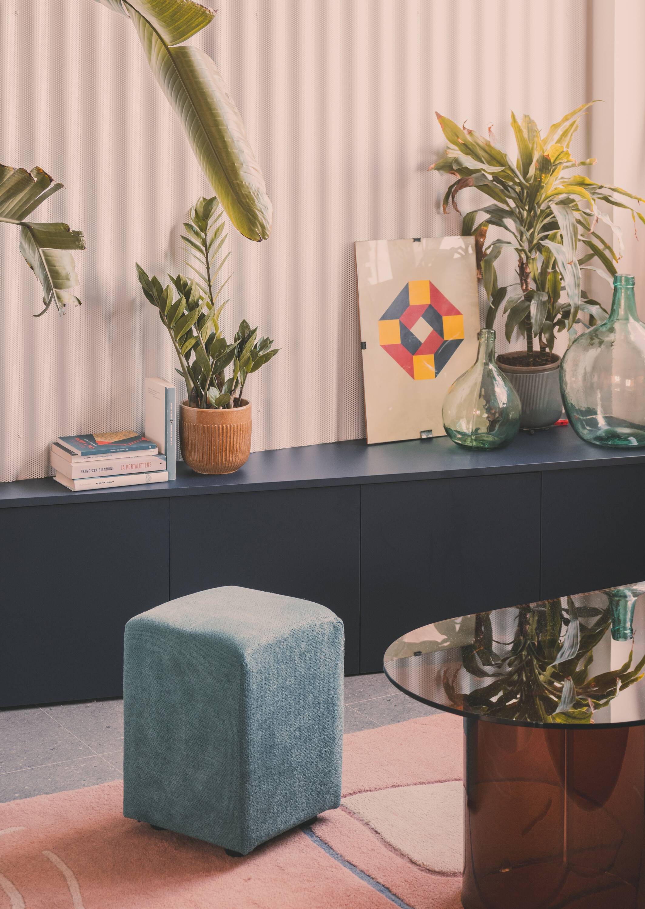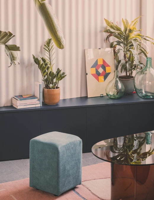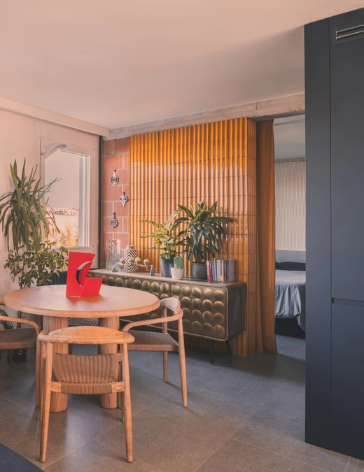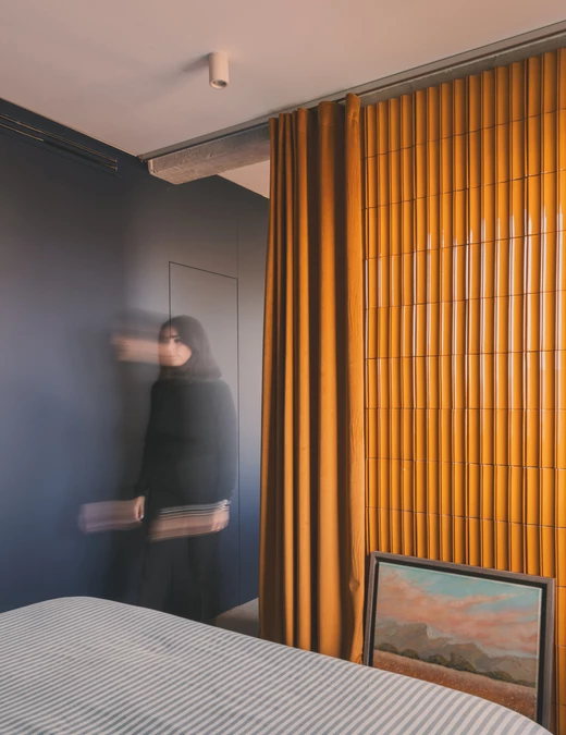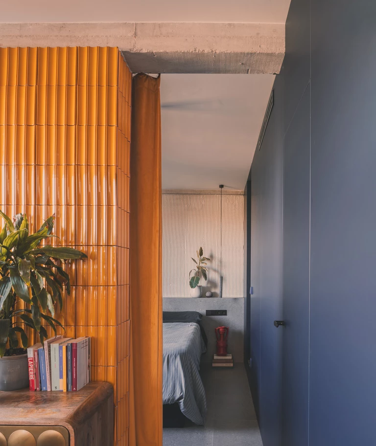 W tym wnętrzu detale prowadzą ze sobą dialog. Aksamitna, złota zasłona oddziela salon od sypialni, a jej miękkie plisy nawiązują do falistych, żółtych płytek ceramicznych na sąsiedniej ścianie.