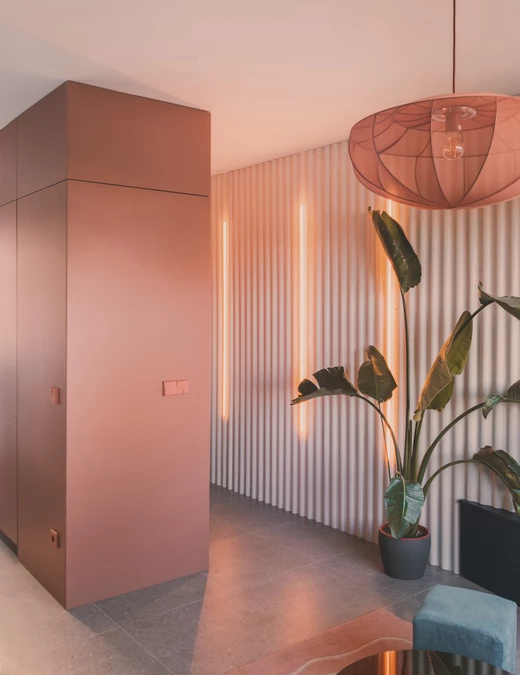 Nowa organizacja przestrzeni opiera się na strategicznym rozmieszczeniu elementów, które definiują strefy poprzez starannie dobrane kolory, materiały i faktury. Sami architekci określają efekt jako trójwymiarowy kolaż, w którym każda ściana jest płótnem dla konkretnego materiału, a meble odgrywają aktywną rolę w kompozycji.