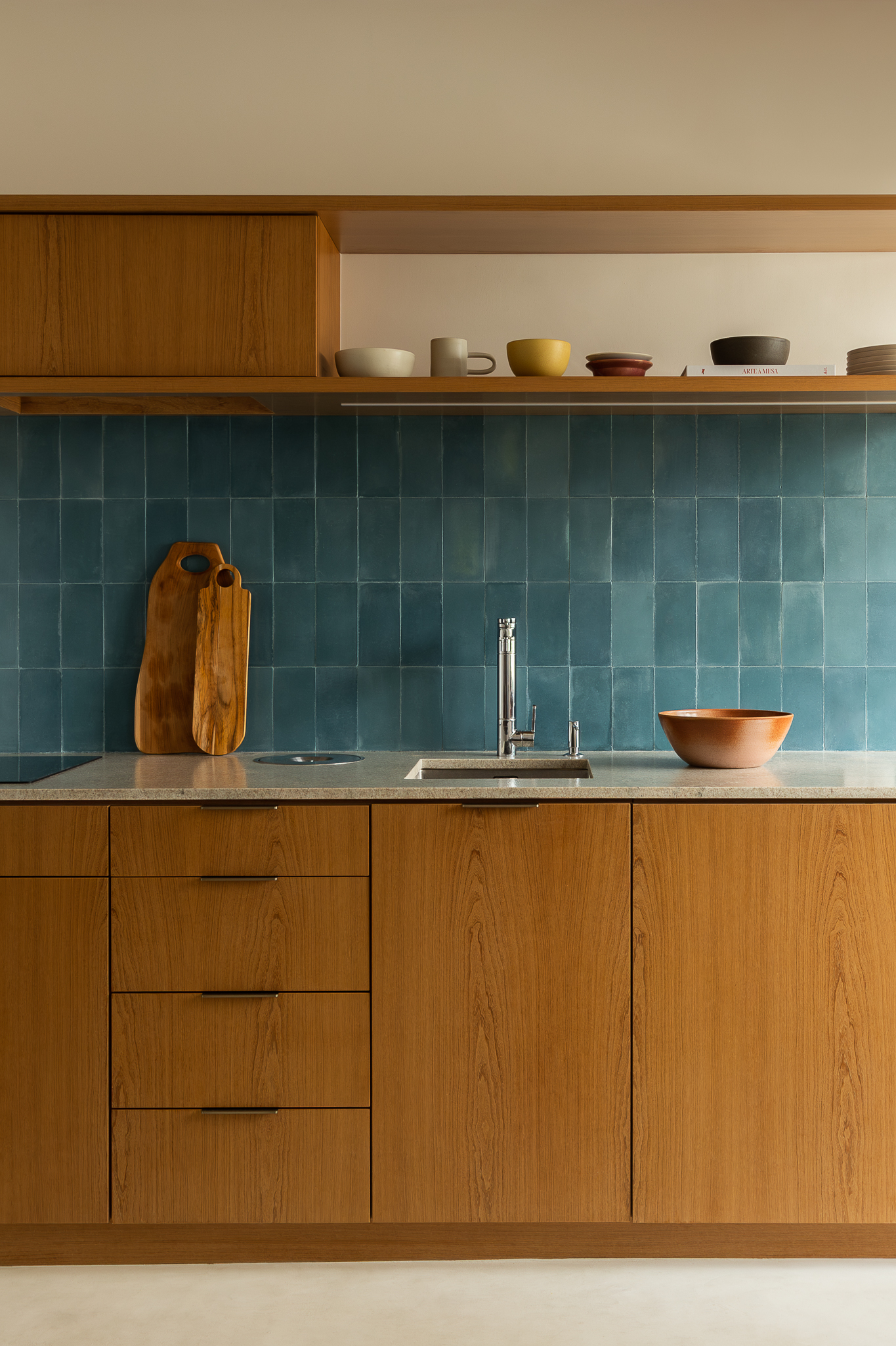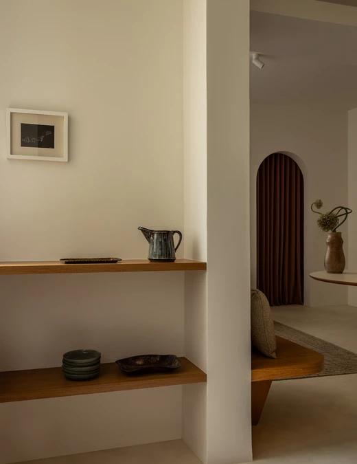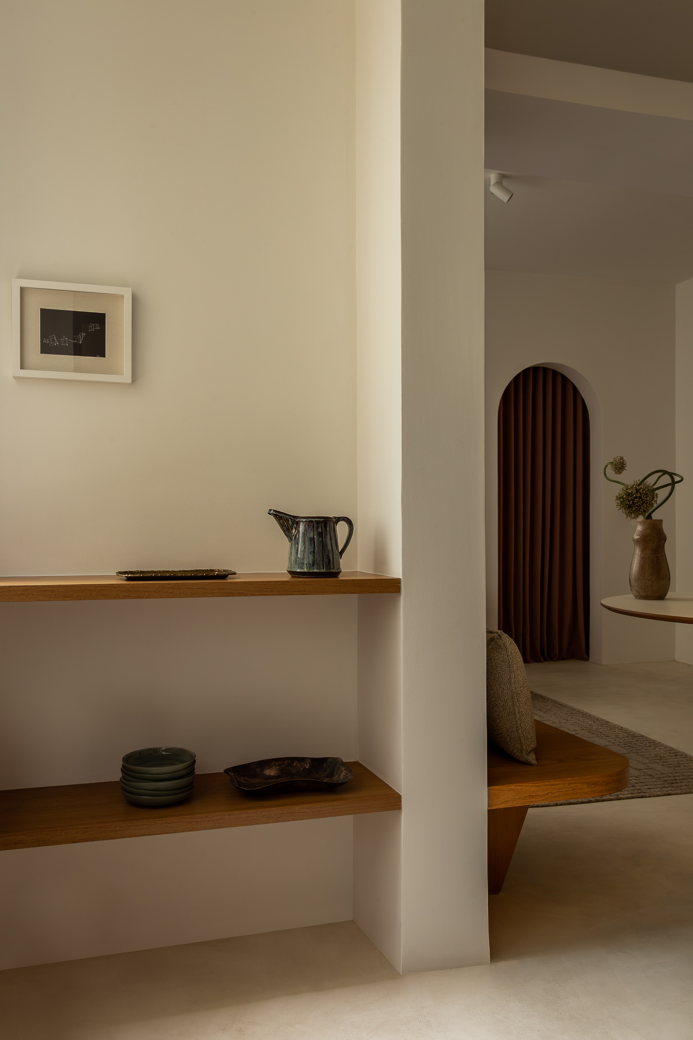 Pierwotny układ wnętrza był mocno podzielony, pełen wąskich przejść i zamkniętych pomieszczeń. Architekt zdecydował się więc zrezygnować ze wszystkich drzwi poza łazienką, tworząc otwarty plan, w którym przestrzeń płynnie przechodzi z jednej funkcji w drugą.