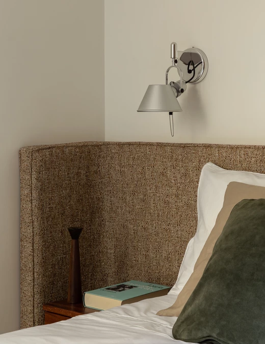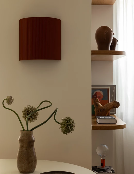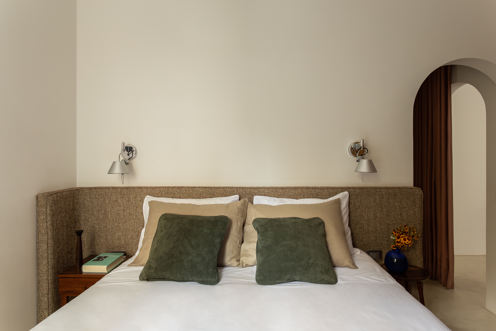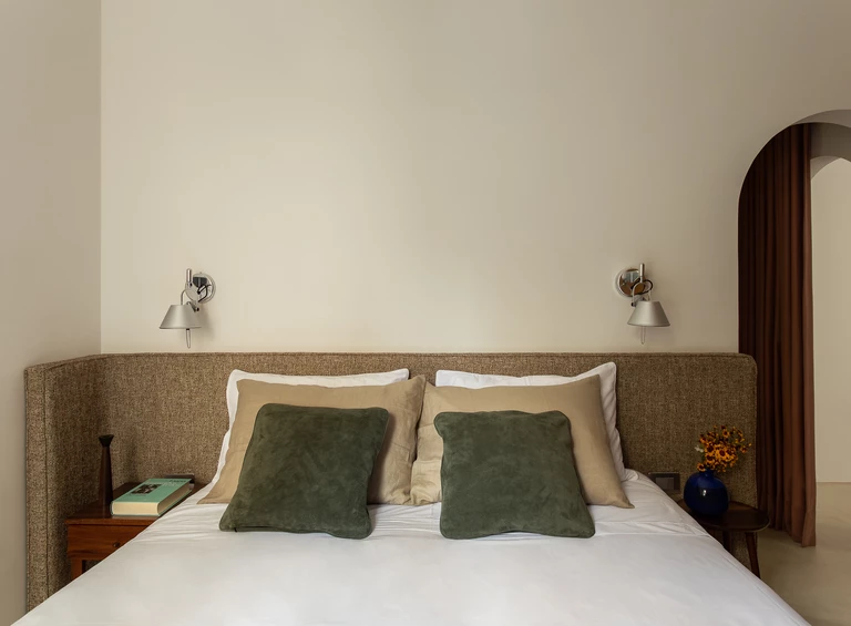 Motyw krzywizny powraca w detalach – w miękko zaoblonym wezgłowiu łóżka, krawędziach szafy i w łazience, w której ściana prysznica tworzy półkę na kosmetyki przy oknie.