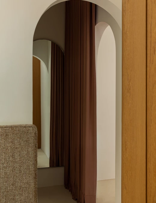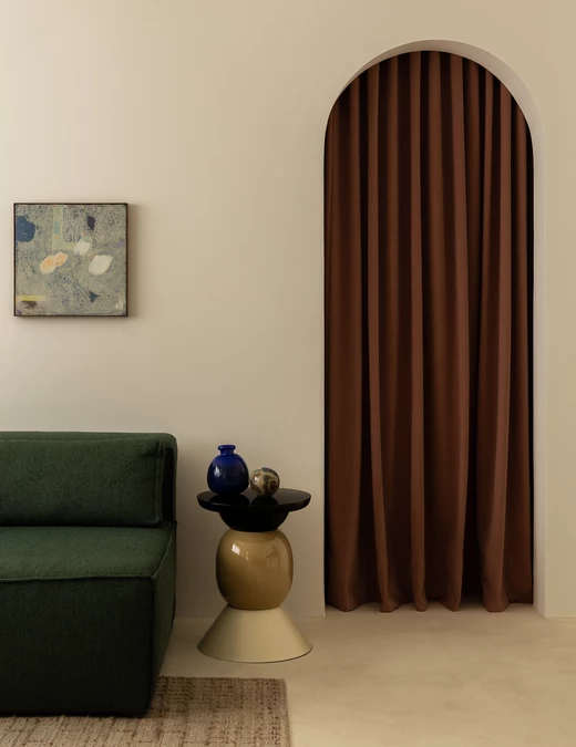 Przy wejściu delikatny łuk oddziela część dzienną od prywatnej. Zamiast drzwi pojawiła się zasłona na zakrzywionej szynie. Pozwala regulować poziom prywatności, gdy w mieszkaniu pojawiają się goście.