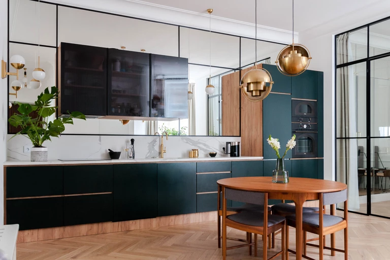 W całym mieszkaniu dominuje biel, jednak by przełamać klimat i ożywić klasykę, kuchnia została wykonana w kolorystyce głębokiej zieleni z dodatkiem drewna i marmuru. Ściana za kuchnią wykonana z geometrycznych podziałów lustra z czarnymi ramkami, jest nawiązaniem do szyby loftowej oddzielającej sypialnie.