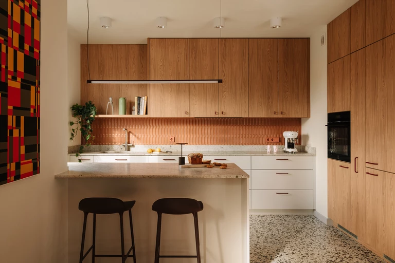 W kuchni zabudowa z drewnianymi i białymi frontami koresponduje z pasem nadblatowym z oryginalnych, ceglanych płytek CERMAG Marazzi. Białą wyspę kuchenną z zabudową stylistycznie łączy użycie jednakowego blatu – „Colonial White” marki Cosentino.