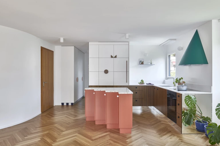 Przestrzeń mieszkania definiują mocne akcenty. Nie ma ich wiele, jednak tło w postaci białych ścian oraz przemyślany dobór mebli pozwalają im wybrzmieć. Wzrok przyciągają stożkowy okap w morskiej zieleni oraz uchwyty w zabudowie kuchennej w kształtach półokręgu i trójkąta. Sercem lokalu zdaje się być wyspa kuchenna o intrygującej, przypominającej harmonijkę formie i mandarynkowej barwie. Podłoga ułożona w jodełkę, płytki lastryko oraz biało-drewniane fronty dodają projektowi ponadprzeciętnego uroku. Kompozycję wnętrza dopełnia przestronna loggia, skąpana w nasyconym kobalcie.
