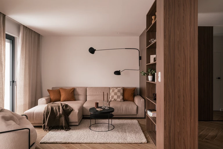 Wnętrze jest minimalistyczne – nie ma tu zbędnych dodatków ani rozwiązań wprowadzonych dla samej estetyki. Dzięki zastosowanej palecie kolorów ziemi mieszkanie jest przytulne i emanuje ciepłą energią. Stosując taką bazę tonalną, projektantki chciały zintegrować wnętrze z przyrodą za oknem. Są więc zabudowy meblowe w odcieniu złamanej bieli czy orzechowe forniry, które dopełniają jasne lniane zasłony i wełniany dywan, rude poduszki czy brązowy pled. W postaci mocniejszego akcentu pojawiają się czarny stolik kawowy, lampy, baterie, uchwyty czy konsola. W mieszkaniu celowo nie ma roślin doniczkowych, ponieważ właścicielka dużo czasu spędza za granicą.