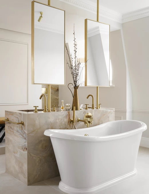 Każde z pomieszczeń ma nieco inny klimat i kolorystykę, jednak bez wątpienia wszystkie łączy piękna kompozycja kolorów, materiałów i kształtów. Aksamit w kolorze ochry, zagłówek o wzorze leśnej zieleni, tkaniny o delikatnej fakturze, czarno-biały kamień merazzi oraz szczotkowane mosiężne detale stanowią razem wysmakowaną całość.
