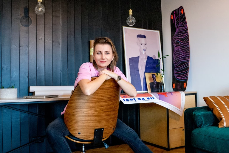 Przy projekcie zależało jej na stworzeniu bardzo wygodnego miejsca do pracy: większość dnia spędza przy komputerze. Rozwiązaniem tego problemu okazało się obszerne biurko z blatem o długości aż 260 centymetrów. Sklejka jest jednym z ulubionych materiałów ilustratorki, dlatego wykonano z niej także regał na książki, stół i komodę.