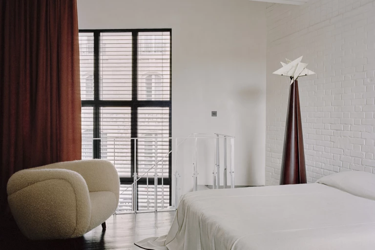 W sypialni nastrój tworzą dekoracje w ciepłych barwach. Paleta obejmuje dębowe deski podłogowe w kolorze ciemnej czekolady, zachwycającą hebanową lampę Pierre Chareau w kolorze śliwki, jasne terakotowe zasłony Lelievre oraz beżowy fotel Pierre Frey z wełny bouclé od Pierre Augustin Rose. Z kolei w łazience główne skrzypce grają szczotkowane umywalki INOX, intrygująco prezentujące się na tle ciemnych ścian.