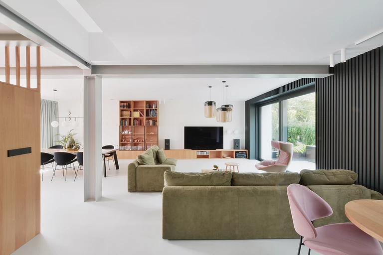 Przenosimy się do domu szeregowego z lat 70. ubiegłego wieku, poddanego gruntownej przebudowie. Nie tylko dobudowano do niego klatkę schodową, obniżono posadzkę parteru, zlikwidowano wszystkie ściany wewnętrzne, ale też powiększono okna i podniesiono dach. Dzięki temu budynek zyskał otwarty plan, który można było swobodnie zaaranżować, odpowiednio rozmieszczając w nim wszystkie funkcje. Projektem przebudowy kierował architekt Aleksander Krajewski, natomiast za projekt wnętrz odpowiadają Grzegorz Layer i Judyta Gandor.