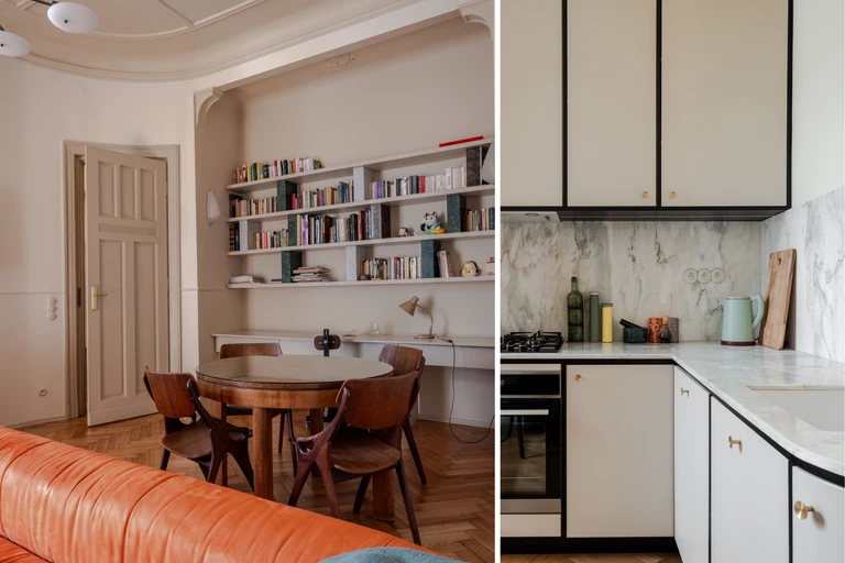 Sercem strefy wypoczynkowej jest rudo-pomarańczowa sofa „Anfibio”, zaprojektowana przez Alessandro Becchi dla marki Giovannetti, której towarzyszy kamienny stolik vintage. W pokoju dziennym znajdziemy też regał na książki z szerokim biurkiem, ozdobiony dekoracyjnymi wspornikami z marmuru. W części jadalnianej stanął stół w stylu art déco z krzesłami duńskiego projektanta Arne Hovmand Olsena. Sufit – poza oryginalną sztukaterią – zdobi żyrandol od 101cph Papillion. Wnętrze wzbogaciły wiszące na ścianach prace Alexandera Kryzhanovsky’ego i Sany Shahmuradovej, a także kinkiety polskiej marki Lexavala.