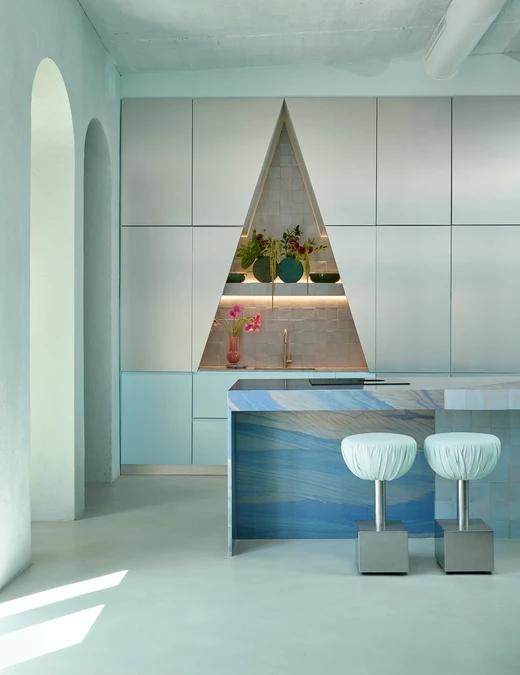 W strefie kuchni i salonu ze smakiem połączono takie materiały, jak marmur, aluminium oraz mikrocement. Użyto tu również ręcznie robionych ceramicznych płytek. We wnętrzu królują wyraziste stożkowe kształty z kolekcji „CONO” Mas Creations, które wykonano z gliny za pomocą druku 3D. Korytarz łączy się z małym tarasem i łazienką.