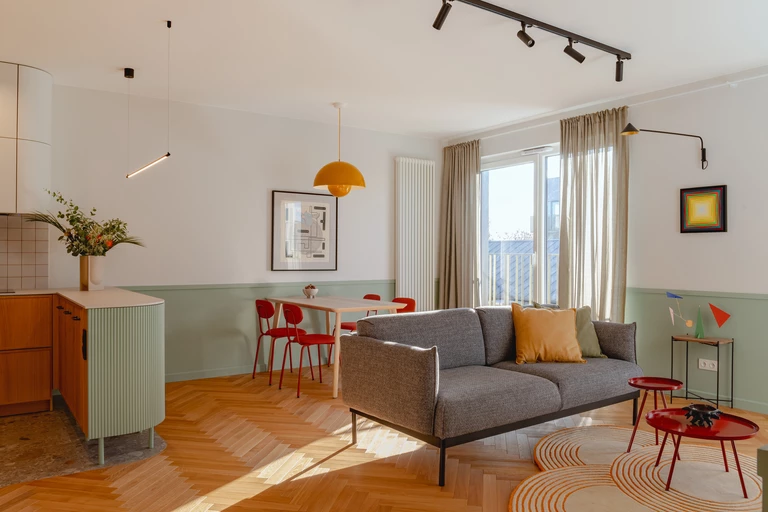 W kuchni podświetlone beżowe płytki nad blatem świetnie współgrają z zielenią półwyspu pokrytego ryflowaniem. Półwysep kolorystycznie połączono z lamperią na ścianie salonu, którą zwieńczono sztukaterią. Na jej tle wspaniale prezentują się ceglane krzesła, minimalistyczny stół i musztardowa lampa „Flowerpot” marki & Tradition. Na ścianie rtv lamperię zastępują dekoracyjne panele 3d Orac Decor, których geometryczna forma doskonale komponuje się z płócienną tapetą o lnianym splocie z oferty francuskiej firmy Casamance. Kompozycję dopełniają neoplastyczne obrazy i rzeźby z kolekcji właścicieli.