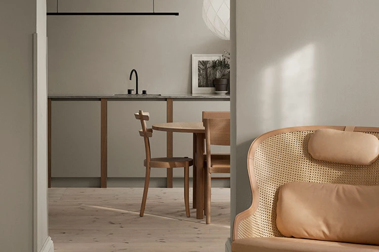 Z zabudową kuchenną w tle doskonale komponują się rattanowy fotel i podnóżek projektu Pierre'a Sindre'a. Stojący w salonie stół „Bond” autorstwa Märty Friman dobrano do ręcznie tuftowanego, białego dywanu „Ines” marki Kasthall, który urzeka puszystą fakturą. Część salonową tworzą również sofa i fotel „Julius” oraz stołki „Elsa” i „Jack” od Färg & Blanche. Nad stołem jadalnianym „TAK” autorstwa Davida Regestama unosi się lampa sufitowa „w151 XL” firmy Wästberg. Wokół stołu umieszczono krzesła „Hedda” projektu Davida Ericssona, które zachwycają formą i niebanalnym siedziskiem z plecionki.