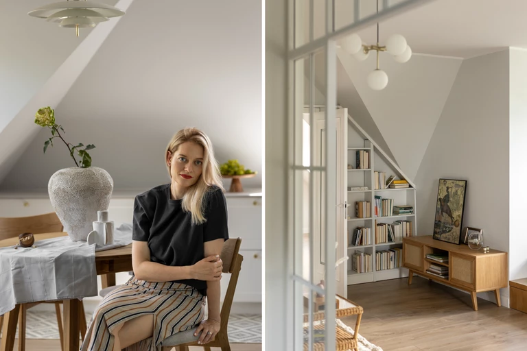 Mieszkanie ma blisko 80 m2 i znajduje się na poddaszu sopockiej kamienicy z 1920 roku. Architektka z pracowni Że ho ho wnętrza zdecydowała się zachować zastane jasne słupy z drewna. Wprowadziła także kilka nieoczywistych rozwiązań, takich jak podest, na którym stoi dębowe biurko w stylu lat 60. Właścicielka mieszkania jest miłośniczką literatury i każdą wolną chwilę spędza na czytaniu, dlatego nie mogło zabraknąć pisarskiego atrybutu – maszyny do pisania Torpedo Klein z 1956 roku. Uwagę przykuwa duża biblioteka projektowana na zamówienie w taki sposób, by mogła wpisać się strychowe skosy.