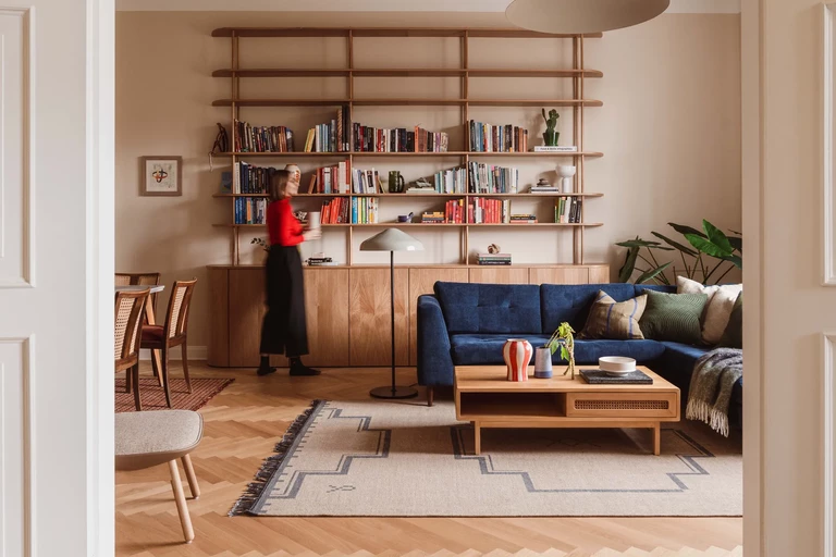 Skandynawskie marki meblowe, takie jak Nordic Knots, Hem czy HAY, współgrają z meblami wykonanymi na zamowienie według projektu Studia Bosko. Wśród nich wyróżnia się obszerny regał na książki, który stanowi centralny punkt salonu.