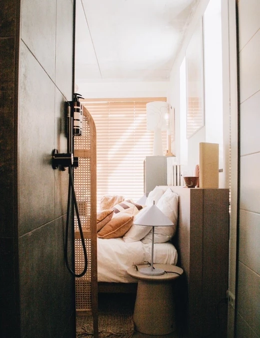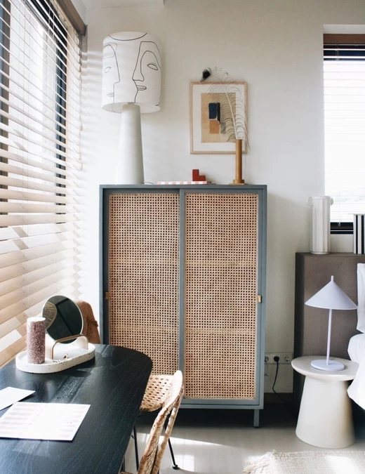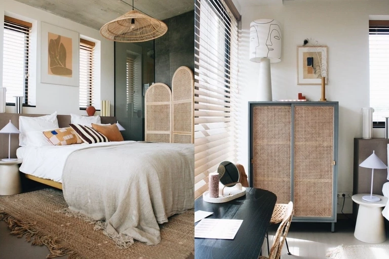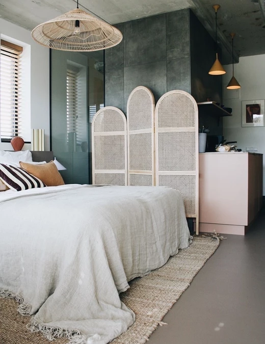 Wysokiej jakości naturalne materiały otulają hotelowe pokoje. Meble z litego drewna świetnie czują się w nadmorskich wnętrzach. Zwłaszcza te wykonane z drewna egzotycznego z elementami plecionki z trzciny lub rattanu. Kolonialne echa (dziś nazywamy ten styl „boho”) można dostrzec w trzyczęściowym parawanie, który dyskretnie wysłania aneks kuchenny oraz w krzesłach z wyplatanymi z trawy morskiej siedziskami. Nawet błękitne komody, w których goście przechowują odzież, wykończone są rattanowymi ekranami, dzięki którym nabierają lekkości, ich prosta forma dostaje stylowego pstryczka. Plecionki na meblach uzupełnia dywan z trawy morskiej.