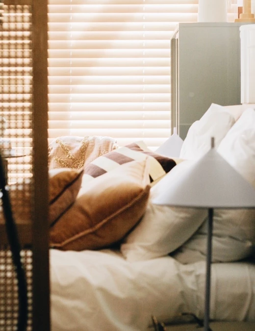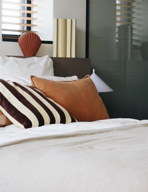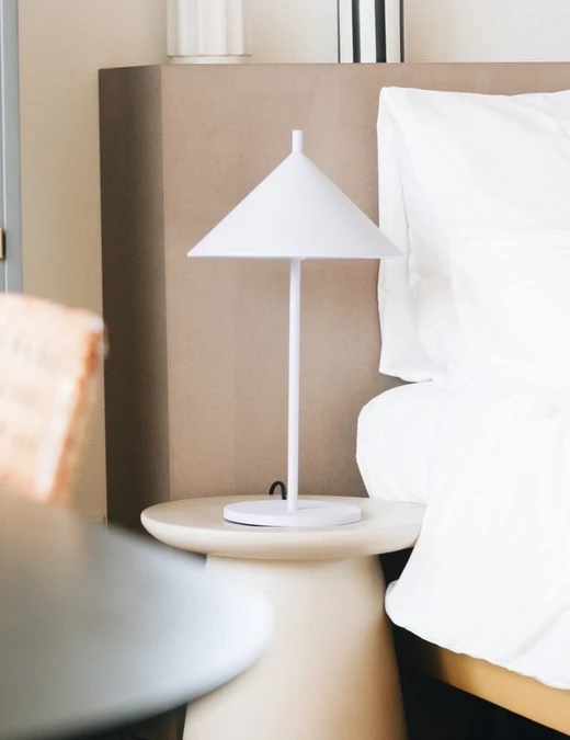 Lampy to ważny element pokoju hotelowego. Nawet, gdy będzie on urządzony idealnie, źle zaprojektowane oświetlenie popsuje cały efekt. W hoteliku nad Morzem Północnym lampy sufitowe kołyszą się na wietrze . Plecionki abażurów rzucają wokół magiczne cienie, a samo światło jest dyskretne i nastrojowe. W pokojach dostrzeżemy również lampy stołowe (artystyczne, białe z abażurem ozdobionym delikatną grafiką przedstawiającą profil kobiety) oraz metalowe nocne lampki w prostym, klasycznym kształcie. Na półce, biurku, komodzie stoi ceramika, dobrana tak, by kolorystycznie nawiązywała do tekstyliów – poduszek, kapy na łóżko, zasłon. Paleta barw oscyluje pomiędzy odcieniem złotego piasku plaży, zasnutego chmurami nieba i grzbietów fal, gdy morze staje się niespokojne. Stonowane wnętrze dynamizują wzorzyste poduszki w paski i kolorowe geometryczne figury.