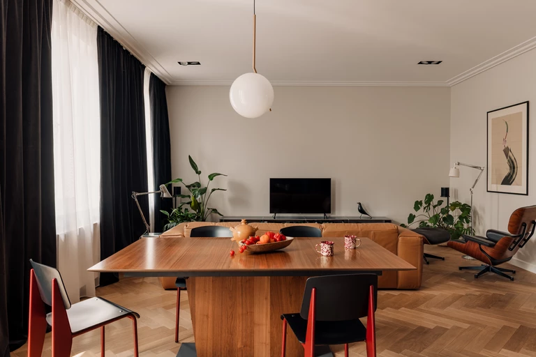 Z czasem przestrzeń mieszkania była wzbogacana o kolejne elementy. Projektantce udało się nabyć swój wymarzony, klasyczny fotel z podnóżkiem „Eames Lounge Chair” projektu Charlesa i Raya Eamesów dla marki Vitra, który stanowi serce salonu. Pod telewizorem wzdłuż ściany znalazł się z kolei granatowy regał modułowy USM, na którym wyeksponowano ulubione albumy i książki właścicielki mieszkania. Przy stole jadalnianym stanęły krzesła zaprojektowane przez Jeana Prouve’a, zaś nad stołem zawisła lampa autorstwa Michaela Anastassiadesa. Przestrzeń uświetnia duński regał vintage, który powstał w manufakturze Omann Jun w latach 70. XX wieku.