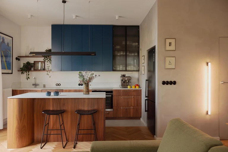 W mieszkaniu dominuje ciepła paleta barw: dębowy parkiet o miodowym wybarwieniu, orzechowy fornir w kuchni czy zieleń sofy. Dopełnieniem tej palety jest szlachetny i głęboki kolor indygo, który pojawia się zarówno w kuchni, jak i na wszystkich drzwiach wewnętrznych.