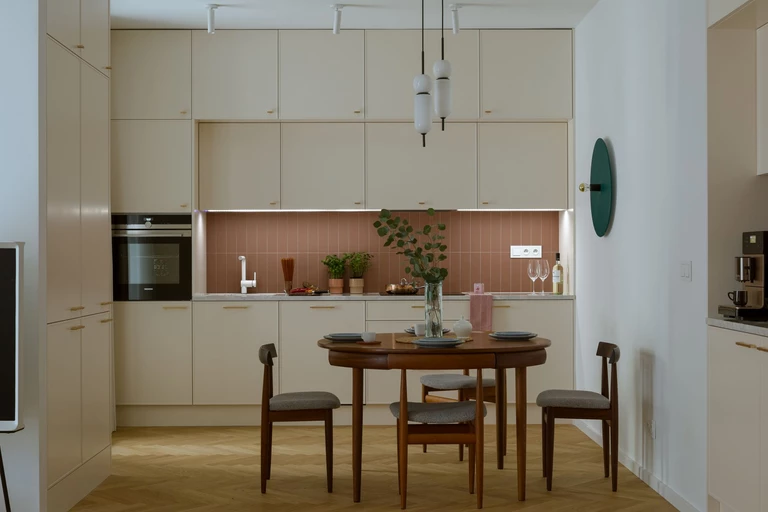 Delikatne, kremowe fronty szafek w kuchni tworzą subtelne tło dla płytek w odcieniu terakoty, które nadają strefie roboczej przytulny, niemal tekstylny charakter. Przemyślany układ zabudowy aż po sufit maksymalnie wykorzystuje dostępną przestrzeń, zapewniając miejsce do przechowywania bez przytłaczania wnętrza.