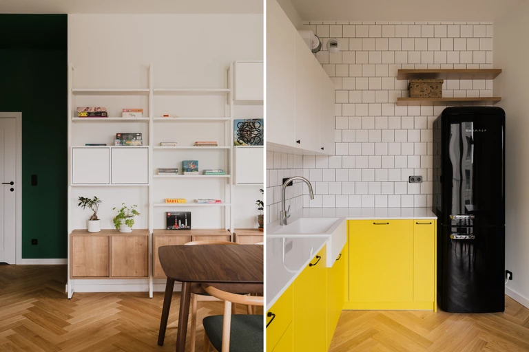 Salon z kuchnią łączy jednolita podłoga wykończona parkietem w klasyczną jodełkę i żółty kolor, który w tej części mieszkania pojawia się na ścianie. Oprócz sofy i stołu jadalnianego znajduje się tu także regał zaprojektowany przez architektkę, który obok półek ma też zamknięte szafki.