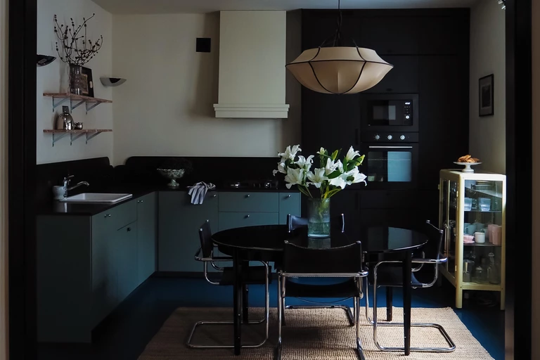 Systemowe meble z Ikea w szlachetnym kolorze szałwii pokryto kamiennymi blatami z charakterystycznymi, zaokrąglonymi fartuchami. Połączenie dwóch kolorów frontów dało poczucie lekkości i zmniejszyło optyczny ciężar mebli w kuchni. Czarny stół wyszukany na aukcji internetowej, chromowane elementy krzeseł, skóra, jutowy dywan oraz kamień tworzą razem zachwycającą całość.