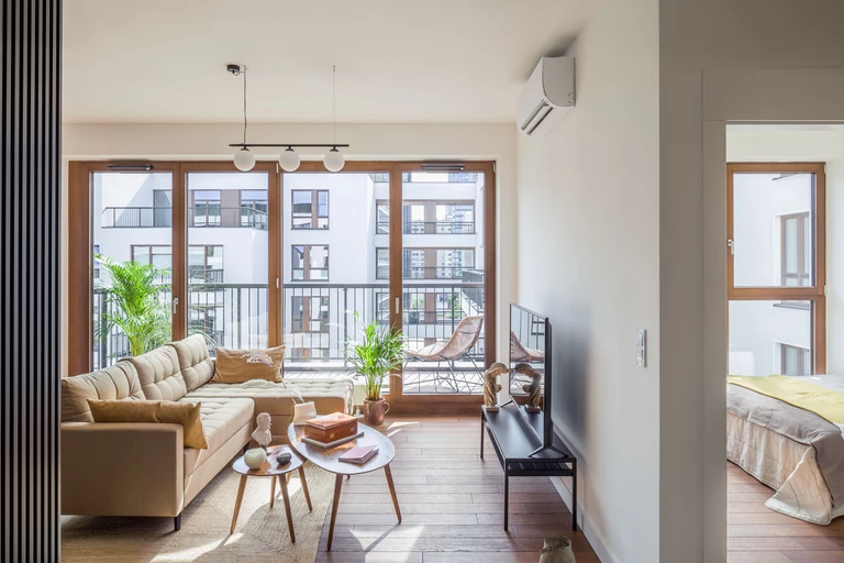 Apartamenty docelowo przeznaczone są na wynajmem długoterminowy dlatego studio postawiło na stonowaną, naturalną paletę barw, która rewelacyjnie uzupełnia się z drewnianą stolarką okien oraz drzwi wejściowych. Dzięki wspomnianym światłu oraz użytej palecie kolorów, mieszkania stanowią wyważoną i spójną przestrzeń o ponadczasowym eleganckim charakterze. Tak samo jak w okolicy inwestycji stare spotyka się z nowym, w mieszkaniach również postawiono na subtelne nawiązania do historii, zwłaszcza do złotej ery modernistycznego wzornictwa z drugiej połowy poprzedniego stulecia.