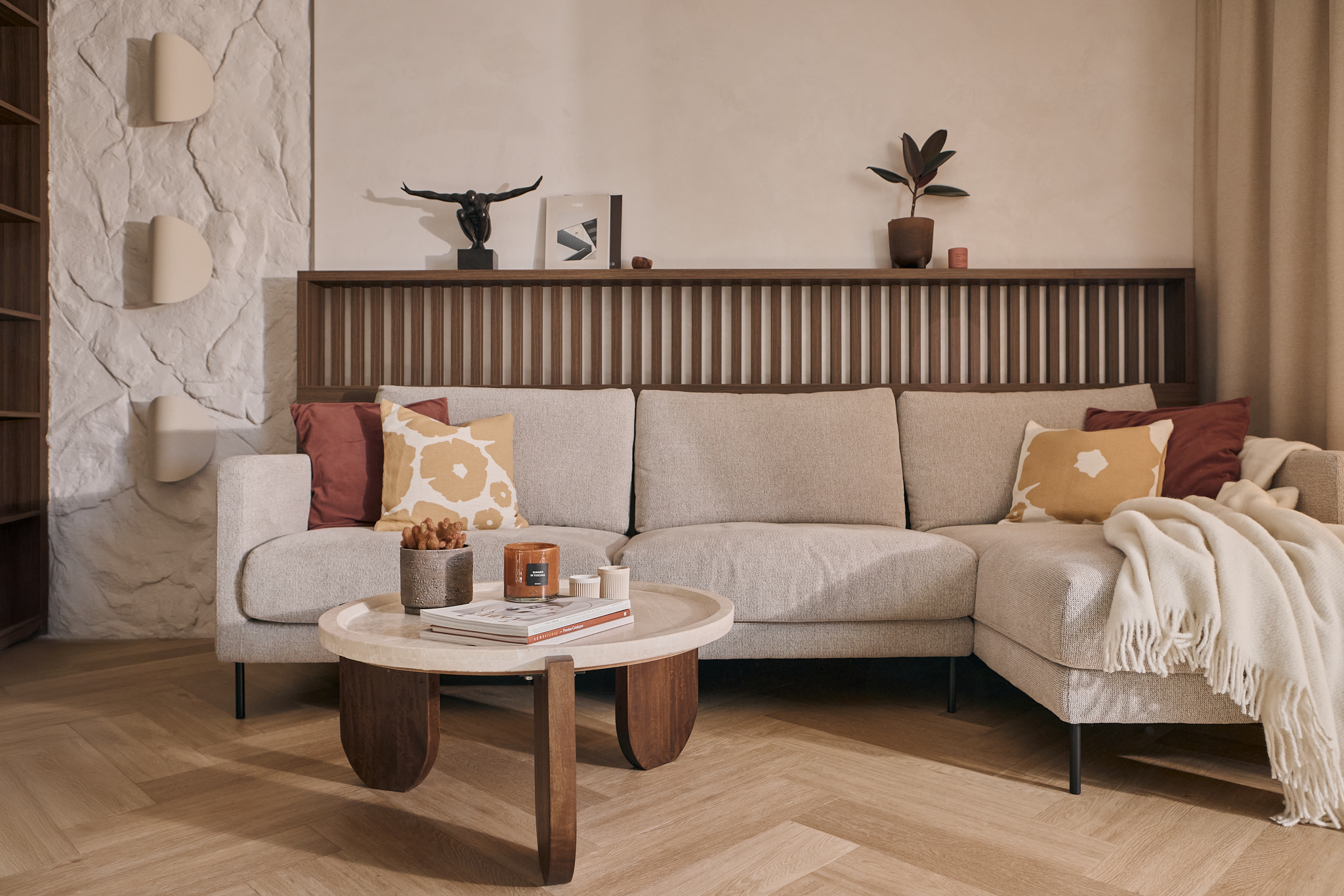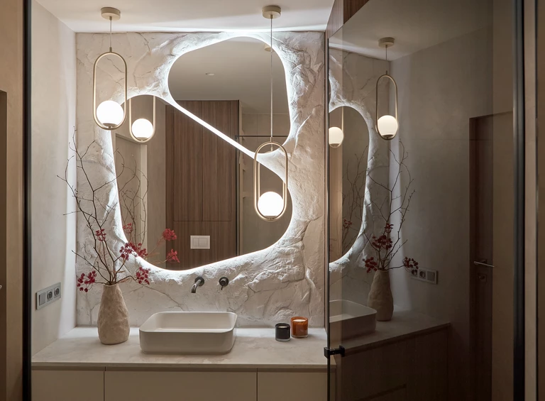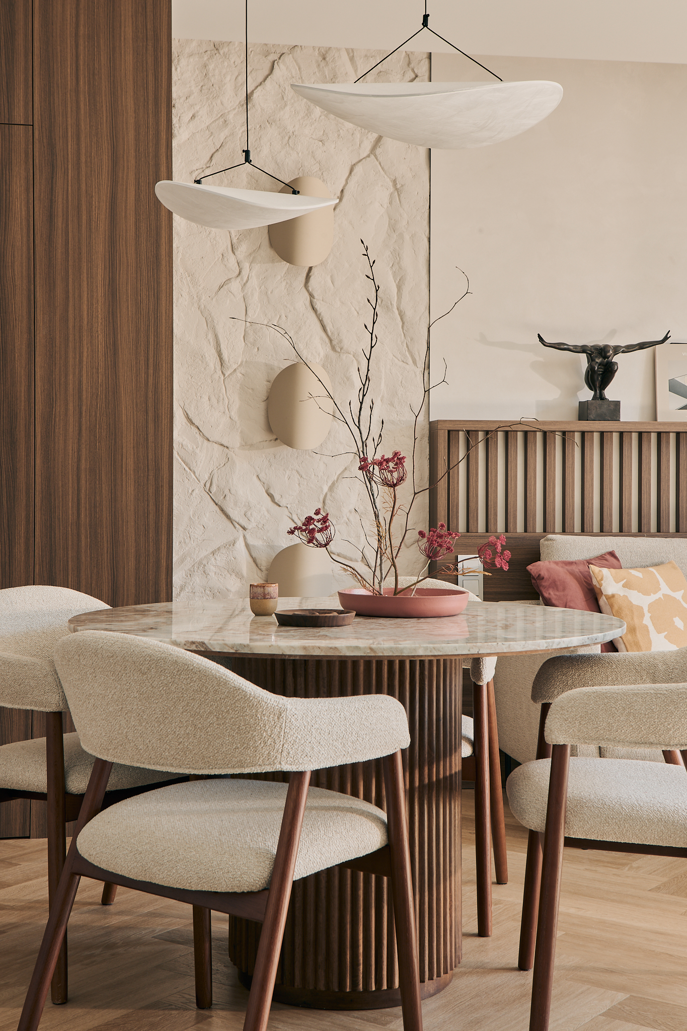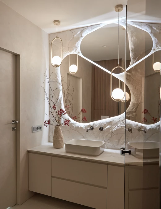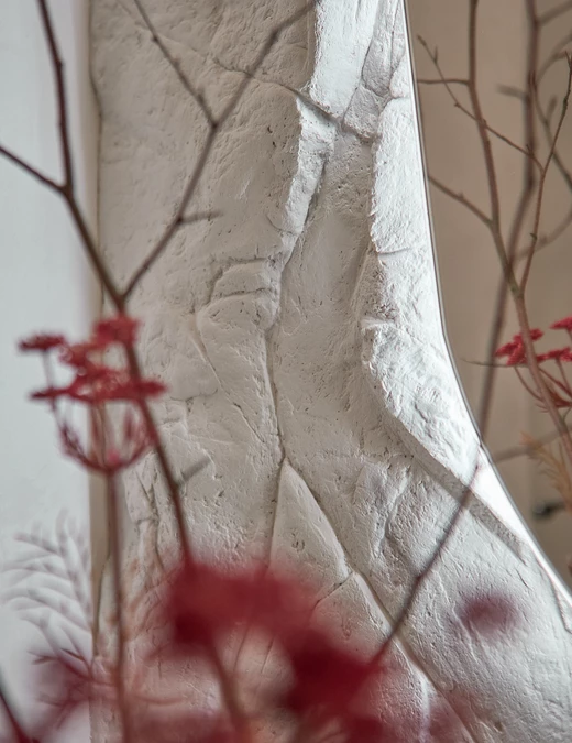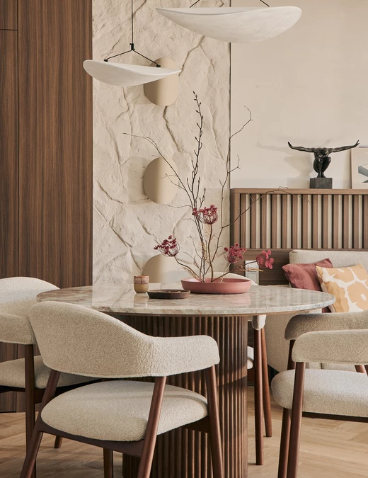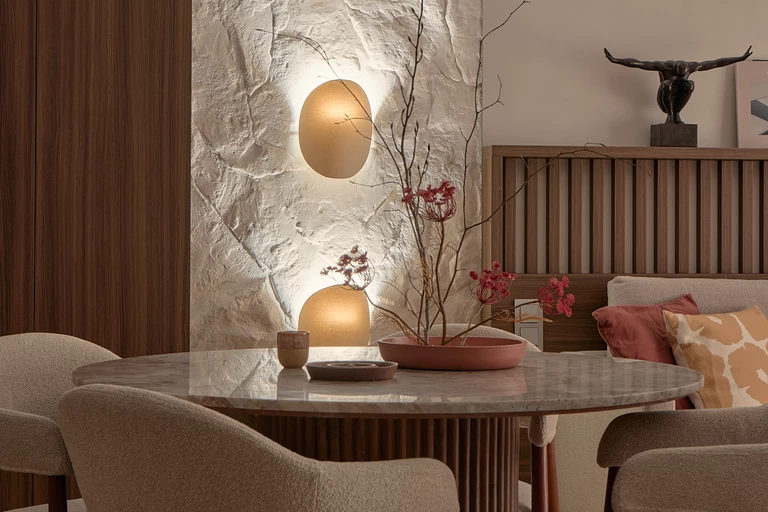 Każdy element został starannie dobrany, by opowiadać historię dotyku, światła i materii. Ciężka, monolityczna forma kamiennej ławy kontrastuje z lekkością naturalnych zasłon. Centralnym punktem aranżacji i jej motywem przewodnim stał się autorski detal ścienny, wykonany z ręcznie modelowanej masy strukturalnej. Ten charakterystyczny element powtarza się konsekwentnie w części dziennej oraz w łazience, budując wizualną spójność projektu.