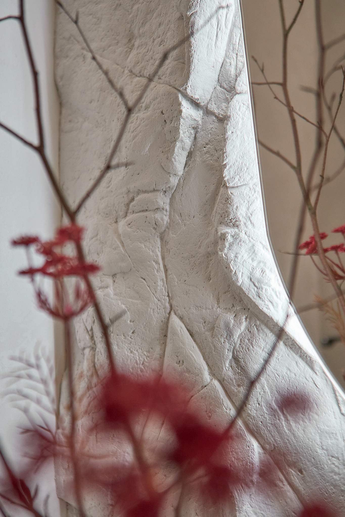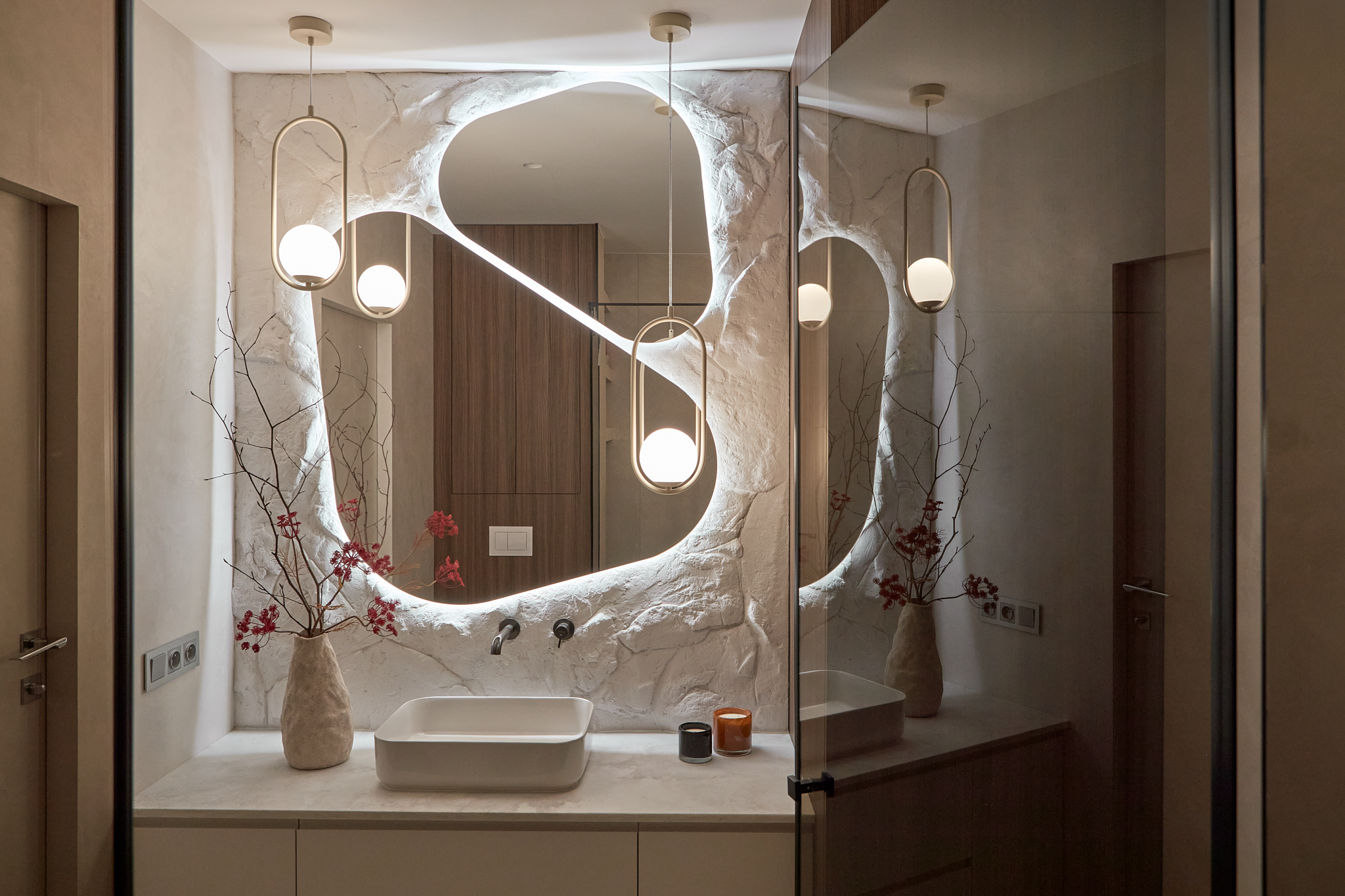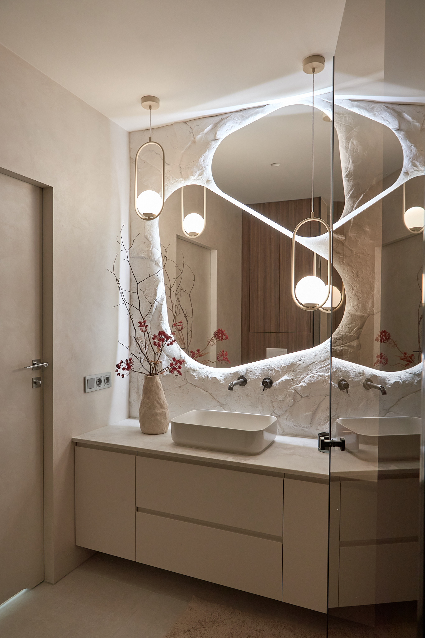 Każdy element został starannie dobrany, by opowiadać historię dotyku, światła i materii. Ciężka, monolityczna forma kamiennej ławy kontrastuje z lekkością naturalnych zasłon. Centralnym punktem aranżacji i jej motywem przewodnim stał się autorski detal ścienny, wykonany z ręcznie modelowanej masy strukturalnej. Ten charakterystyczny element powtarza się konsekwentnie w części dziennej oraz w łazience, budując wizualną spójność projektu.