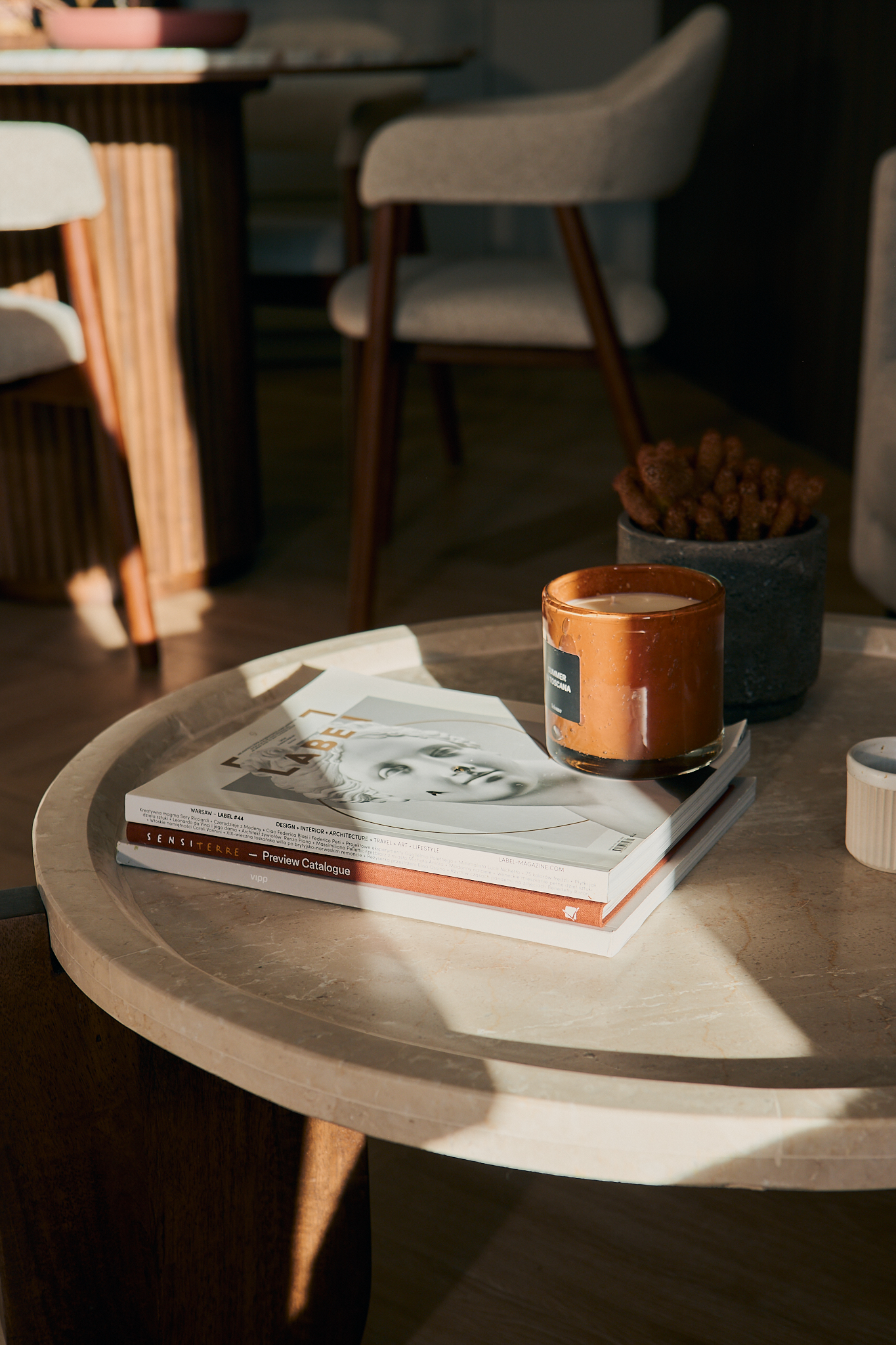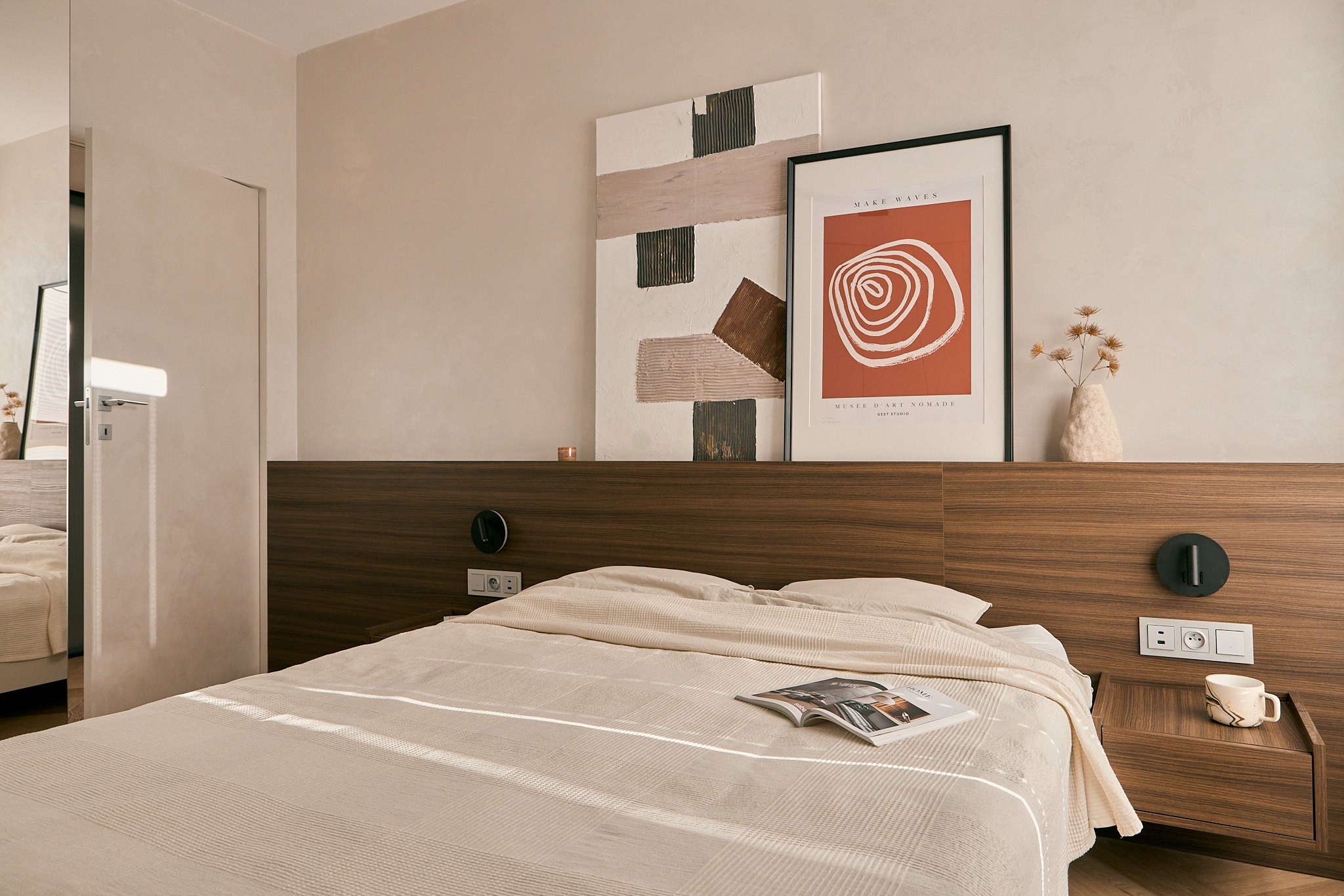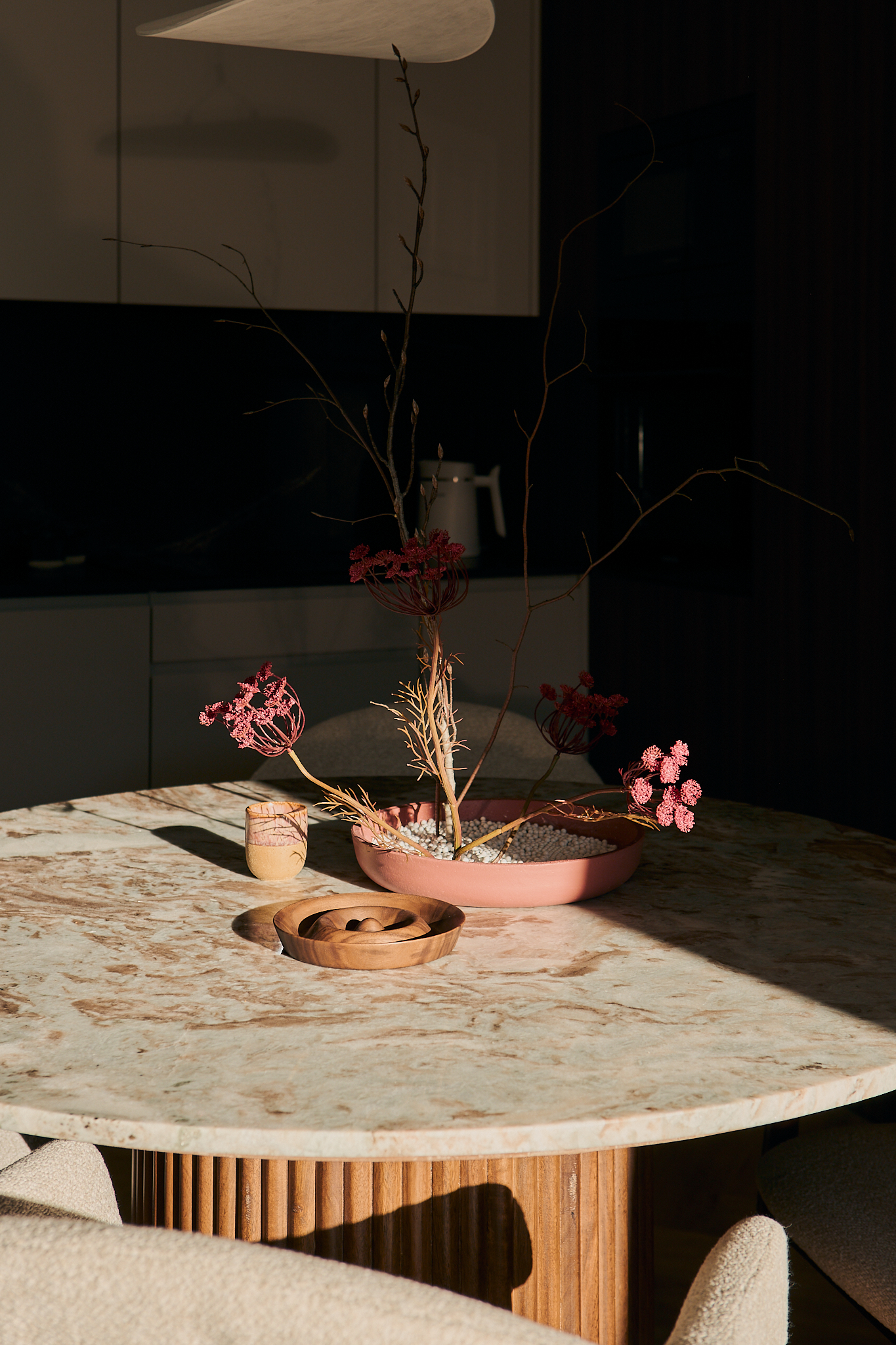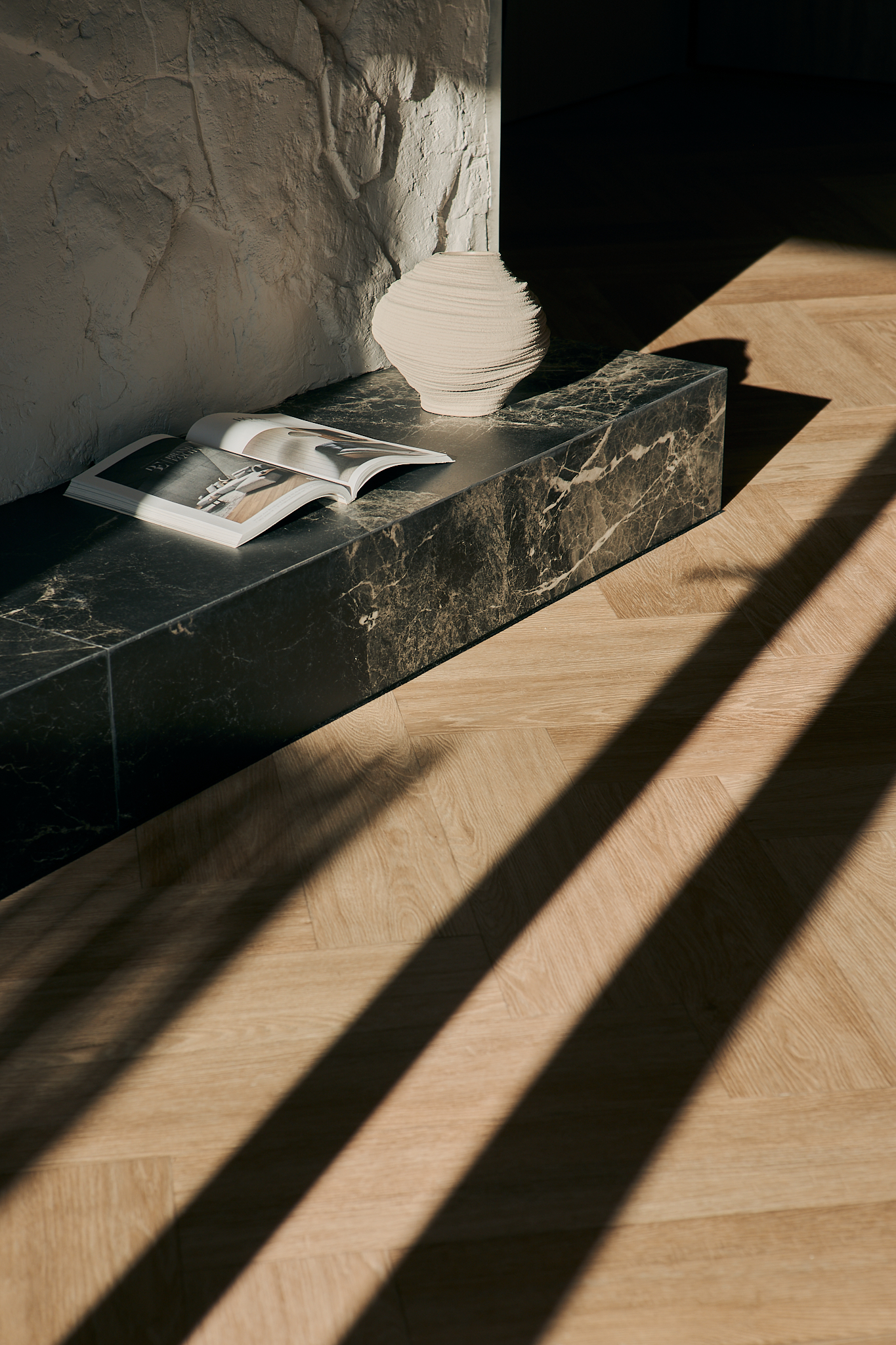 Wnętrze żyje w rytmie dnia – światło miękko podkreśla jego warstwy, budując atmosferę intymności i skupienia i tworząc wnętrze skupione na harmonii, oddechu i świadomym doświadczaniu przestrzeni.