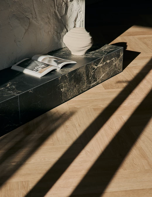 W tej harmonijnej scenerii kluczowy akcent stanowi drewno w ciepłym, miękkim tonie. Ociepla ono przestrzeń i podkreśla szlachetność wykończeń. Równie istotną rolę odgrywają faktury. Architekci wprowadzili tynki strukturalne, jak Metropolis Senso Silver, które nadają ścianom głębi i definiują rytm światła przesuwającego się po ich powierzchni.