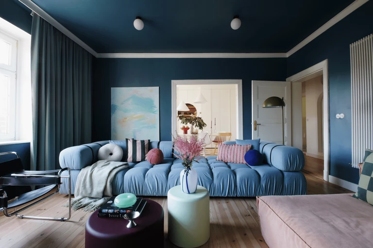 Kierunek aranżacji salonu wyznaczył granatowy kolor ścian, wybrany przez Kubę. Zwykłe meble i standardowa biel wydawały się zbyt nijakie w takim towarzystwie. Wybór padł więc na błękitną kanapę i kolorowe dodatki w duch dopamine decor. Z granatem świetnie zgrały się oliwkowa lampa podłogowa i szafka RTV oraz bordowe i koralowe dodatki oraz fotel. Warto też zwrócić uwagę na klasyk wzornictwa Bauhausu, fotel „Vassily” projektu Marcela Breurea z lat 20. ubiegłego wieku.