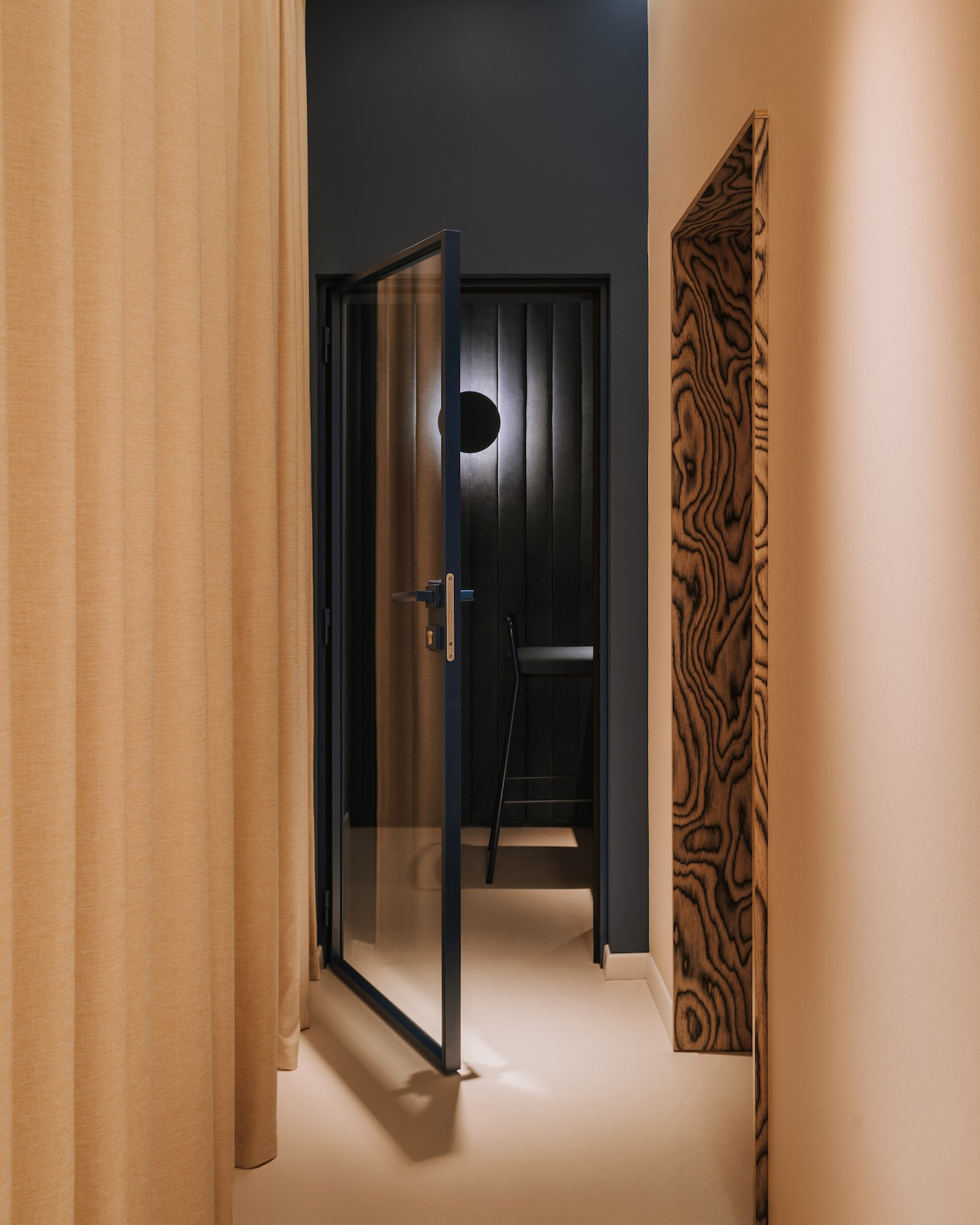 Unikalną tożsamość miejsca budują wysokiej jakości materiały oraz śmiałe zestawienia faktur. Neutralne tło stanowią mikrocementowa posadzka, ściany wykończone dekoracyjnym tynkiem i tapetami marki Vescom. Kontrastuje z nimi efektowna zabudowa meblowa pokryta włoskim fornirem ALPI z kolekcji Sottsass, konsekwentnie powtarzającym się w całym biurze.
