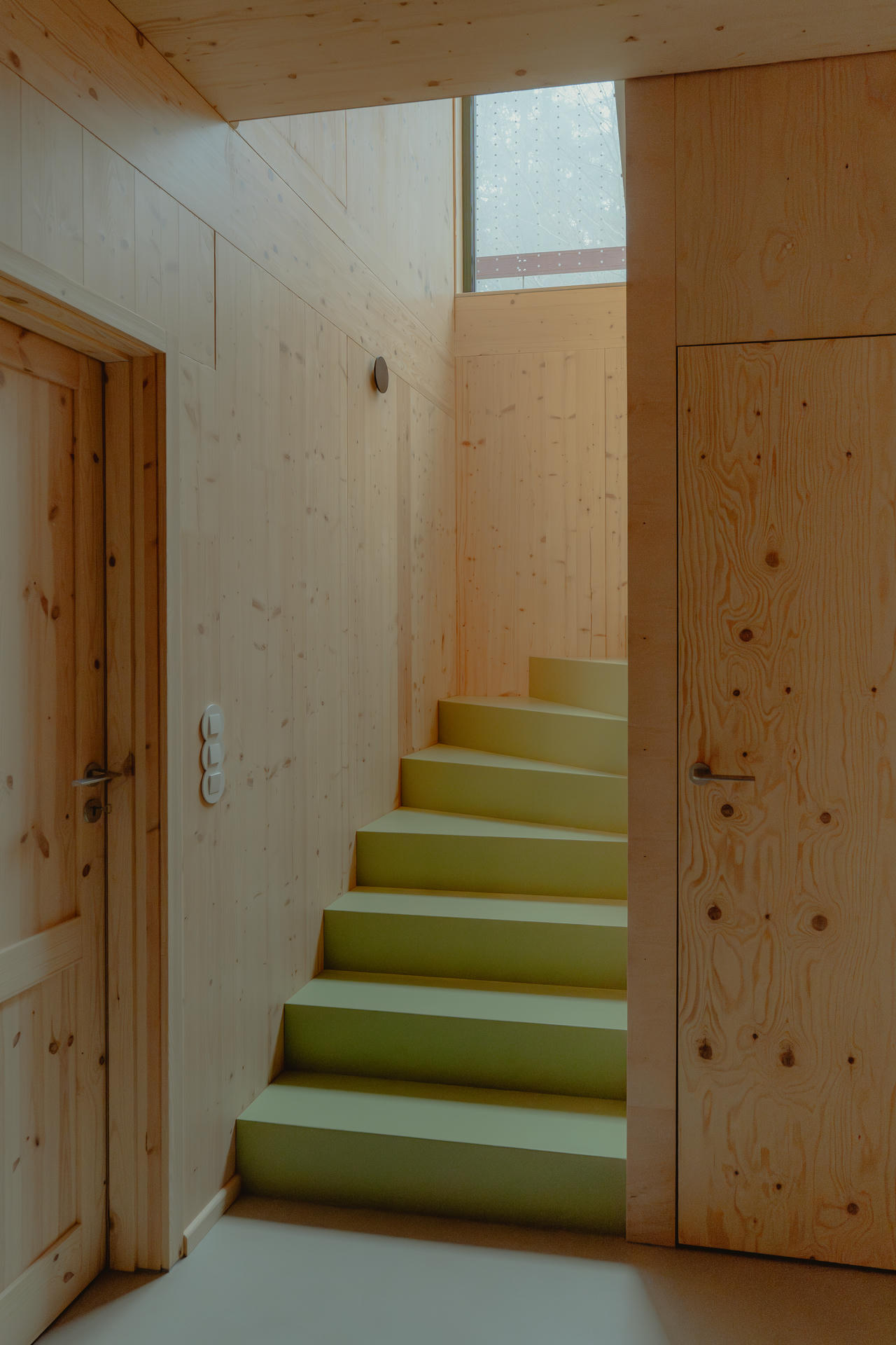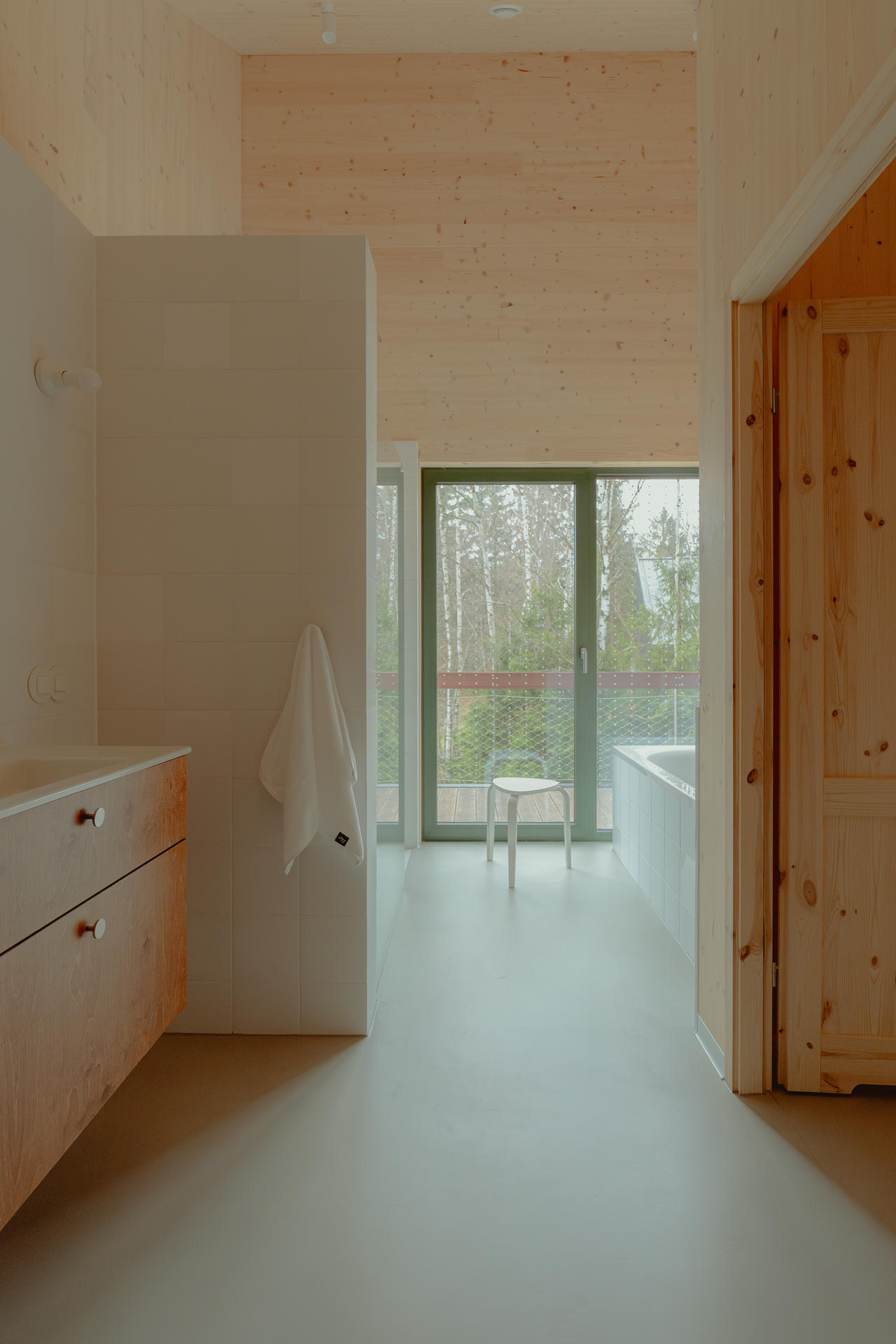 Choć parcela jest rozległa, jej duża część pozostaje zalesiona. Zgodnie z założeniami zabudowa mogła powstać wyłącznie na terenach pozbawionych drzew i wrzosowisk. To właśnie krajobraz wyznaczył miejsca dla budynków i wymusił ich ustawienie pod skosem – tak, aby jak najlepiej korzystały ze światła dziennego, a jednocześnie zachowywały prywatność i piękny widok na las.