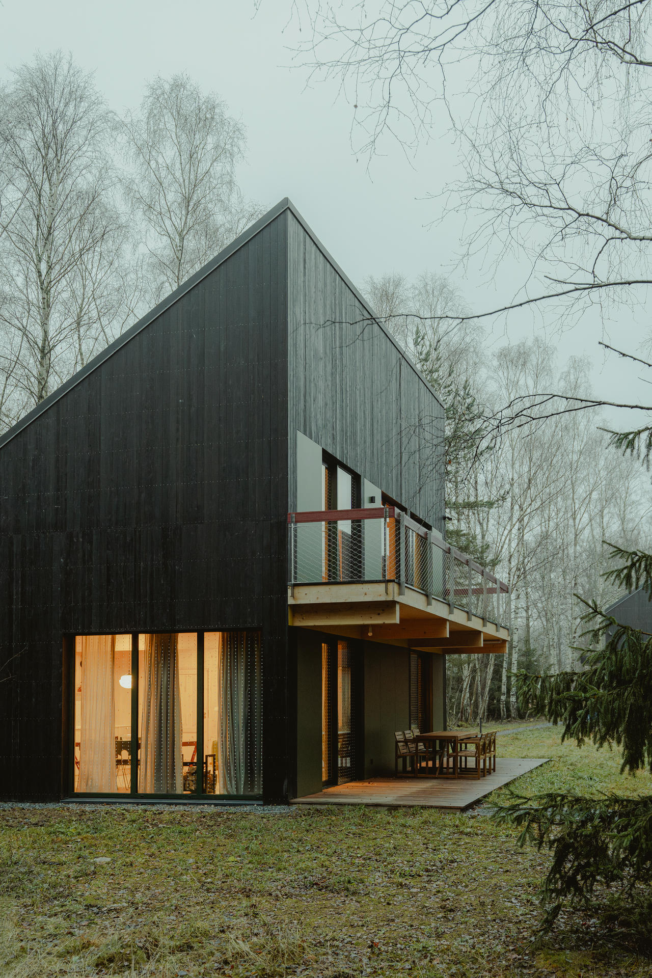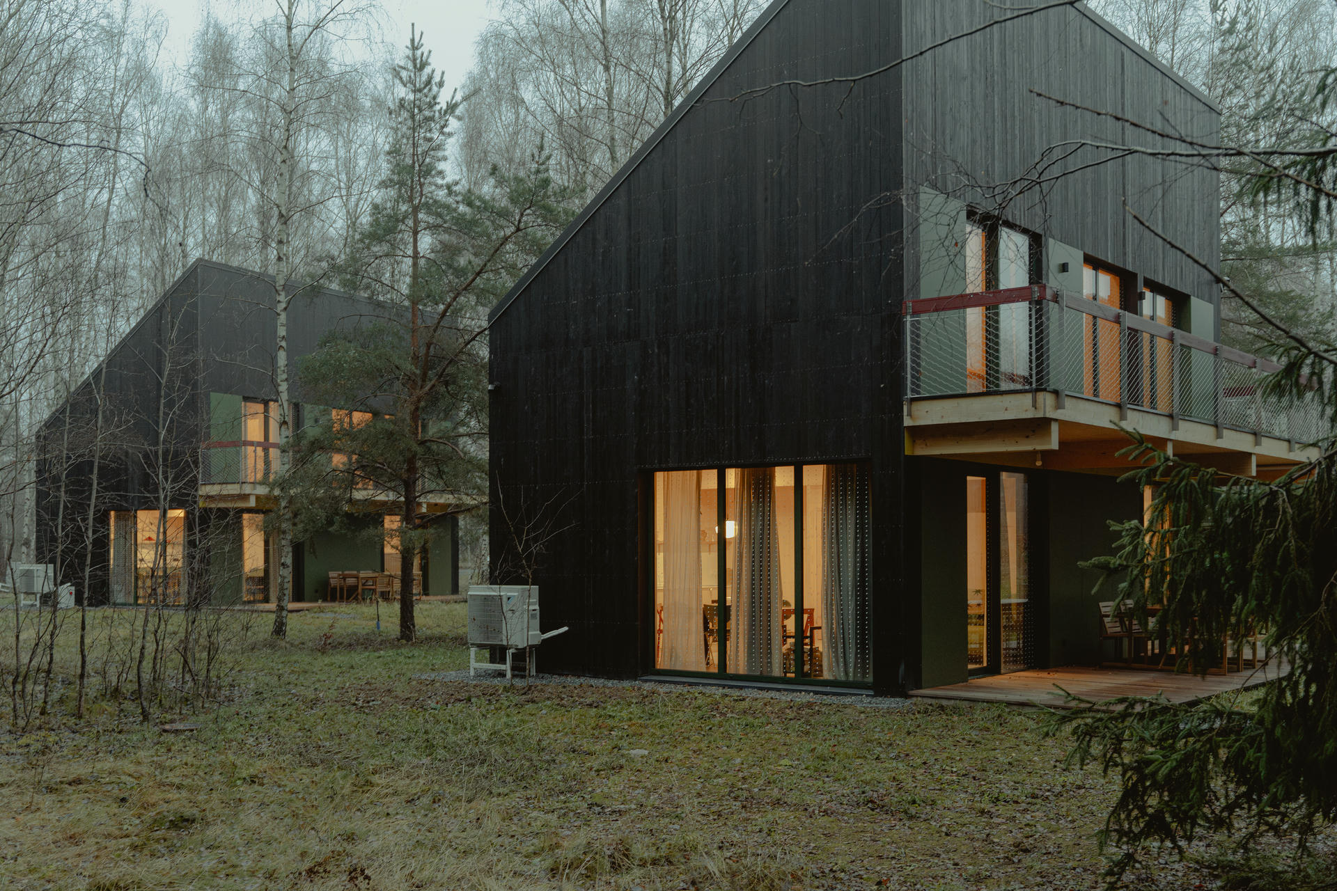Miejscowy Plan nie narzucił rygorystycznych zapisów, dzięki czemu architekt mógł zaproponować dachy jednospadowe, tym samym unikając popularnego schematu „nowoczesnej stodoły”. Czarne, drewniane elewacje uzupełniono subtelnymi akcentami w kolorze żółtym, bordo i ciemnej zieleni. W tak dobranej palecie kolorystycznej domy stapiają się z otoczeniem. Jednocześnie są wyraziste i nienachalne.