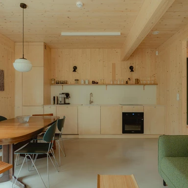 „Wnętrza, które stworzyłyśmy w Madde Studio, miały być naturalnym przedłużeniem tej koncepcji: spójne, oszczędne w formie i funkcjonalne, ale jednocześnie ciepłe i przyjazne” – wyjaśniają projektantki. Drewno, sklejka, ceramika, metal i mikrocement tworzą bazę, która dobrze się zestarzeje i pozwoli na odnowienie po latach użytkowania.