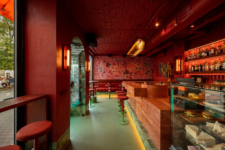 Zainspirowaliśmy się kolorami weneckiej flagi (czyli czerwienią i złotem), które dominują we wszystkich wykończeniach wnętrza, a jako element zaskoczenia wprowadziliśmy motyw „Aqua Alta”. Wysoka woda pojawia się w lokalu w postaci soczystej zieleni na wysokości kilkudziesięciu centymetrów i zabarwia nogi od stołów, krzeseł, cokoły, posadzkę, witryny i zalewa cały poziom -1.