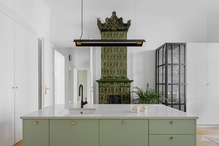 Zielony piec kaflowy jest widoczny także z kuchni. Stanowi mocny akcent w tym wnętrzu. Ściany, zabudowa obok pieca oraz zabudowa we wnęce utrzymane są w kolorze białym. Uwagę zwracają sztukaterie na suficie, kolejny oryginalny element we wnętrzu. Kolor zabudowy kuchennej swobodnie nawiązuje do barwy pieca.