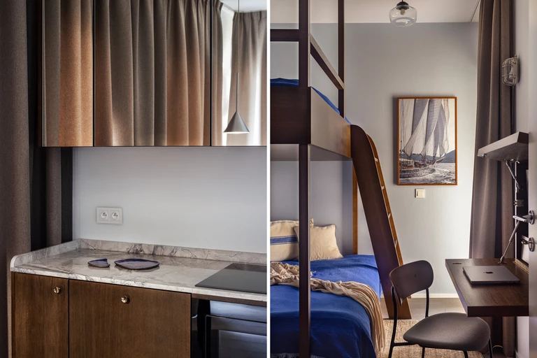 „Rodzinnym sportem klientów jest żeglarstwo, dlatego motywem przewodnim wnętrza miała być ich morska pasja. Chcieliśmy jednak uniknąć sztampowych rozwiązań i rustykalnego, nadmorskiego stylu mieszkań tego typu” – opowiada Katarzyna Schudy. Wspólnie z inwestorami postawili na wnętrze inspirowane eleganckim jachtem. Mając to na uwadze, przestrzeń wypełniono ciemnym drewnem i głębokim granatem. „Ostatecznie wnętrze jest oszczędne w formie, nastrojowe i eleganckie” – podkreśla.