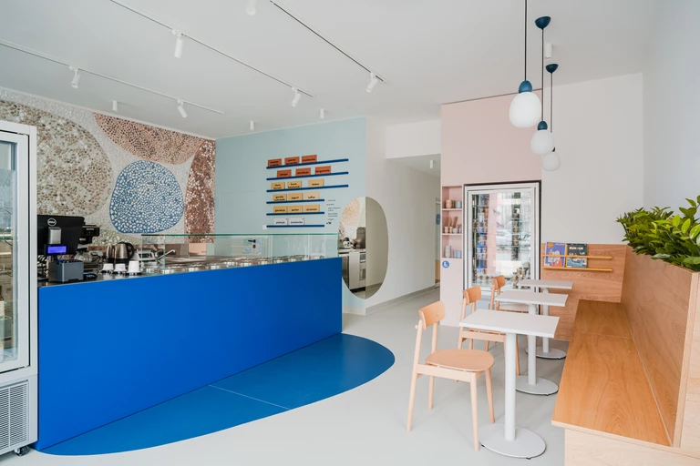 Pomimo subtelnego wzoru i kolorystyki mozaika stanowi wyraziste tło. Aranżacja budowana jest wokół rozbudowanej lady sprzedażowej, która znajduje się w centrum lokalu.