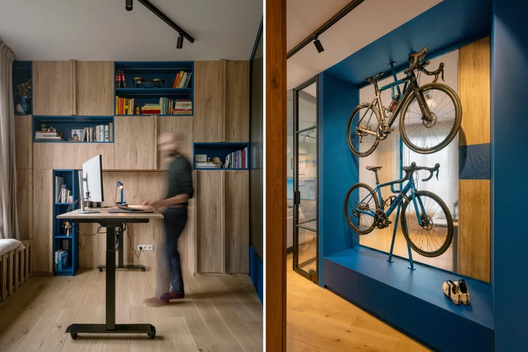 Rowery zawiesza się na specjalnie zaprojektowanych do tego wieszakach. Intensywnie niebieski kolor zabudowy przełamuje stonowaną paletę barw wnętrza. Jedną ze ścian mebla wykonano ze szkła zbrojonego, co sprawia, że rowery można podziwiać również od strony salonu i gabinetu.
