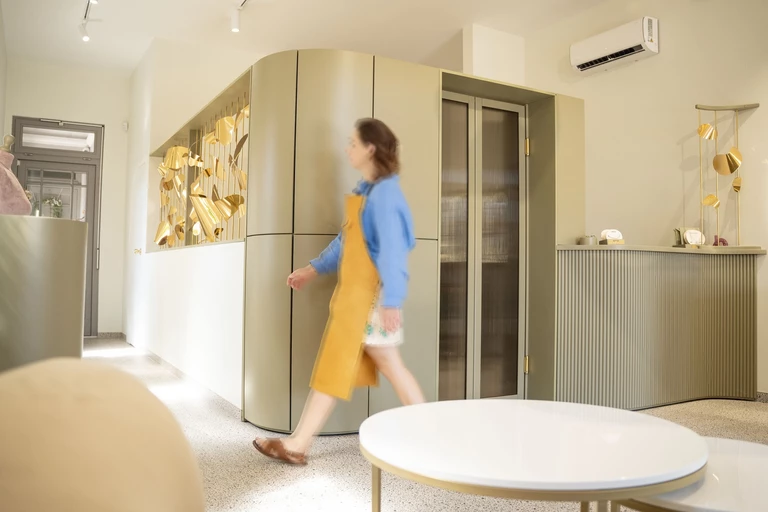Gabloty na biżuterie są mobilne, dzięki czemu Weronika może łatwo przearanżować pracownię na potrzeby warsztatów. Charakterystycznym, powtarzającym się motywem są złote nieregularne, abstrakcyjne elementy, które dekorują sufit oraz korytarz w pracowni.