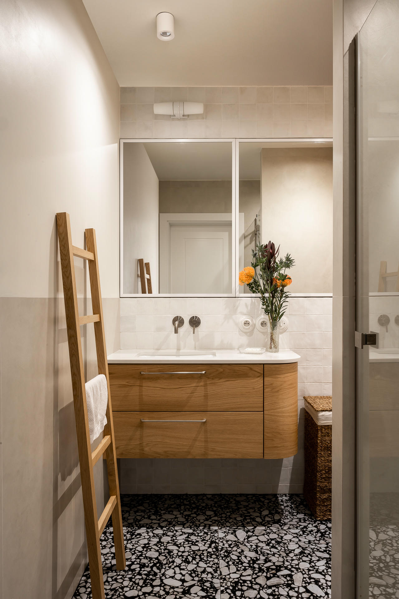 Znacznie większa niż pierwotnie łazienka utrzymana jest w naturalnych barwach oraz materiałach, które powtarzają się w pozostałych pomieszczeniach, dzięki czemu uzyskano spójny efekt. „A dla kontrastu zastosowaliśmy czarno-białą podłogę o wzorze lastryko, nawiązując do materiału, który pierwotnie znajdował się w tej przestrzeni” – dodaje autorka projektu