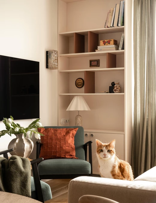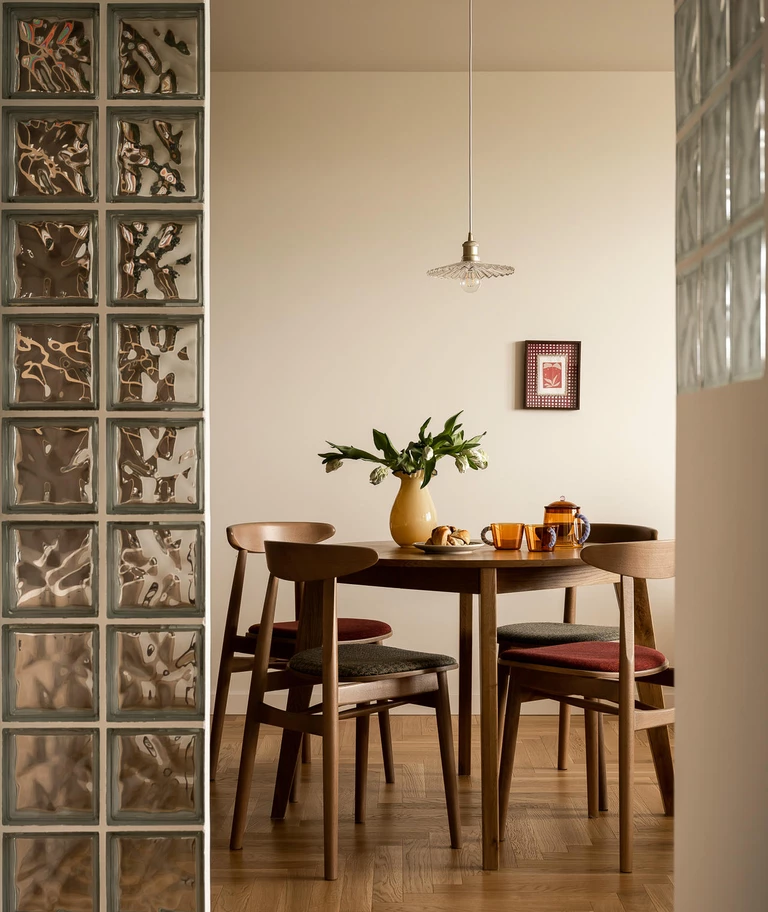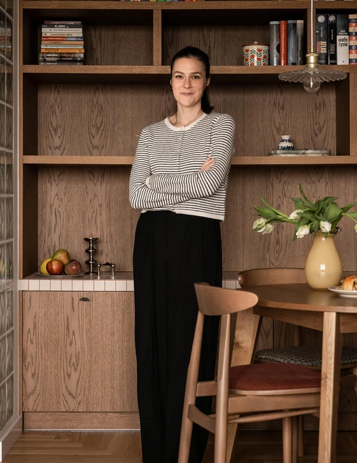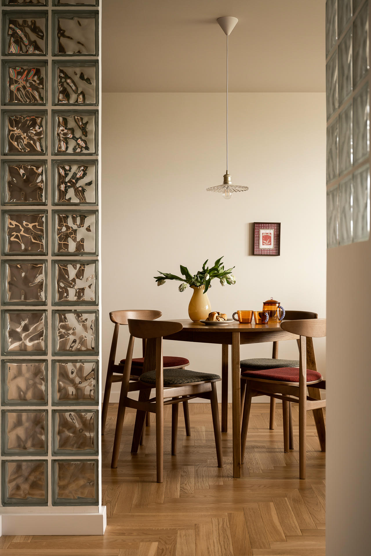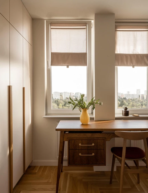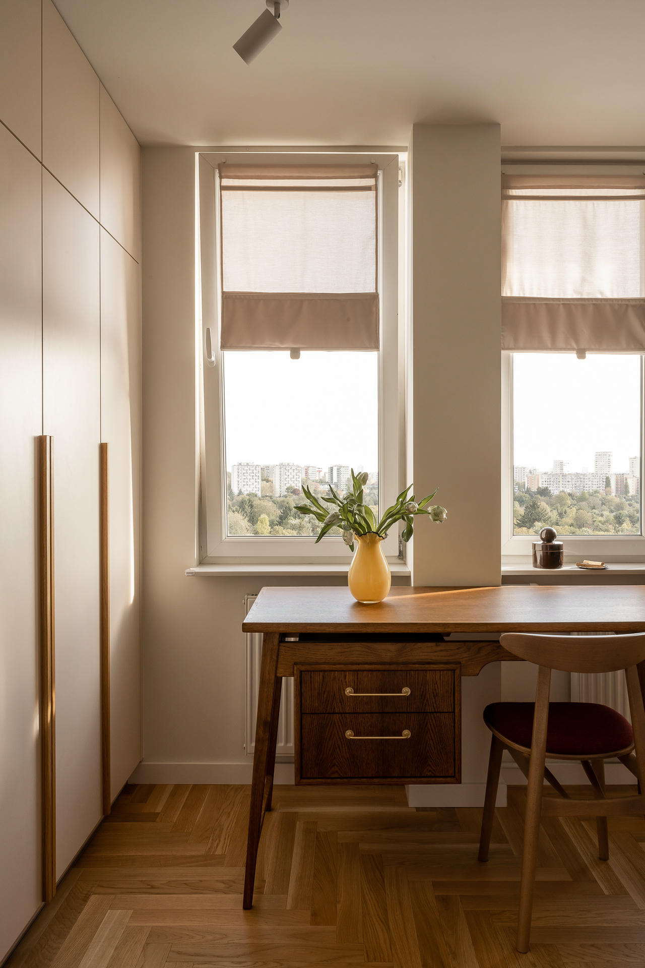 Dodatkowym wyzwaniem okazała się specyfika budownictwa – niski sufit i okna zlokalizowane wyłącznie po jednej stronie mieszkania. Aby rozświetlić wnętrza i nie odbierać uwagi od widoku za oknami, projektantka postawiła na naturalne materiały, ponadczasowe formy i ciepłą paletę kolorów. „Mieszkanie miało być przede wszystkim wygodne, zaprojektowane z myślą o codziennym komforcie” – wspomina.