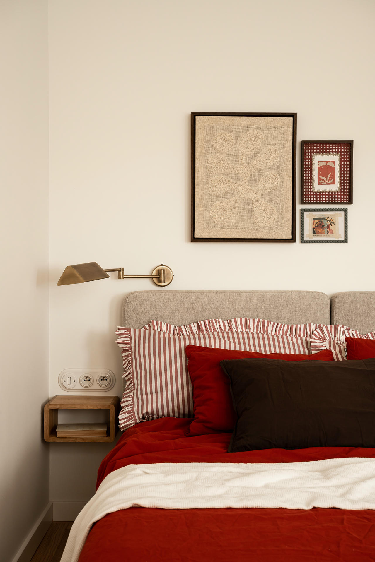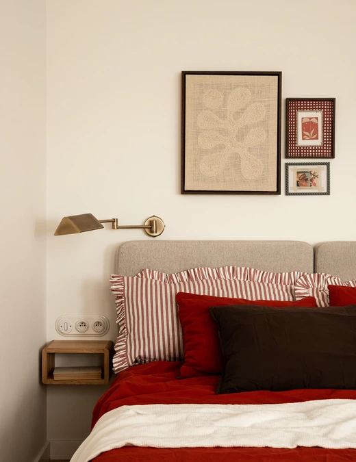 Sypialnię powiększono tak, aby oprócz komfortowej szafy powstało w niej również miejsce do pracy. Dominuje w niej spokojny klimat, zbudowany za pomocą delikatnych tkanin, subtelnego światła oraz dekoracji i mebli o miękkich, ponadczasowych formach.
