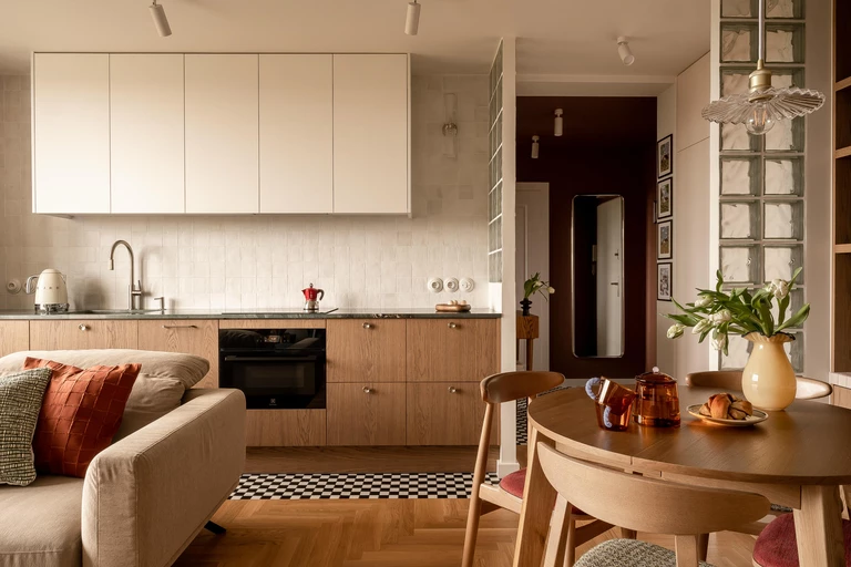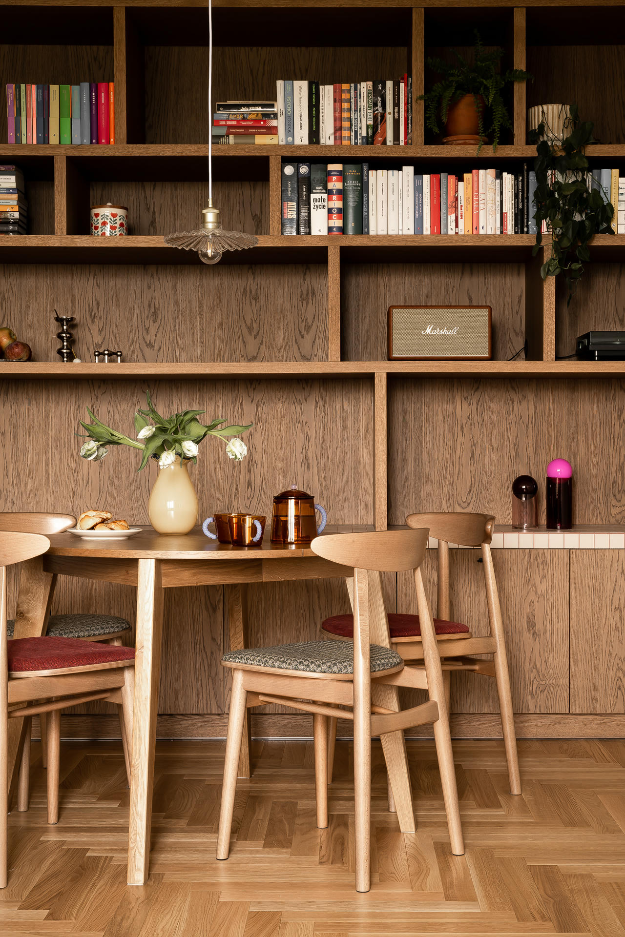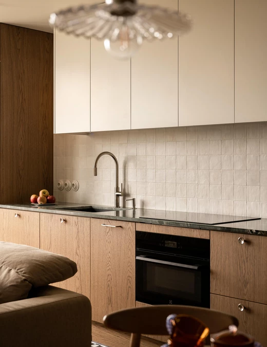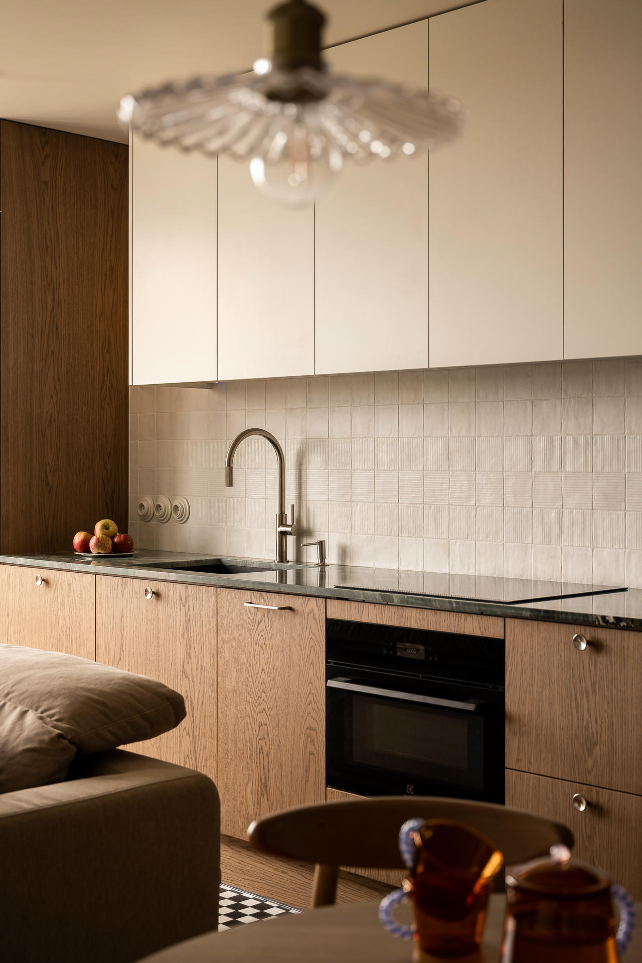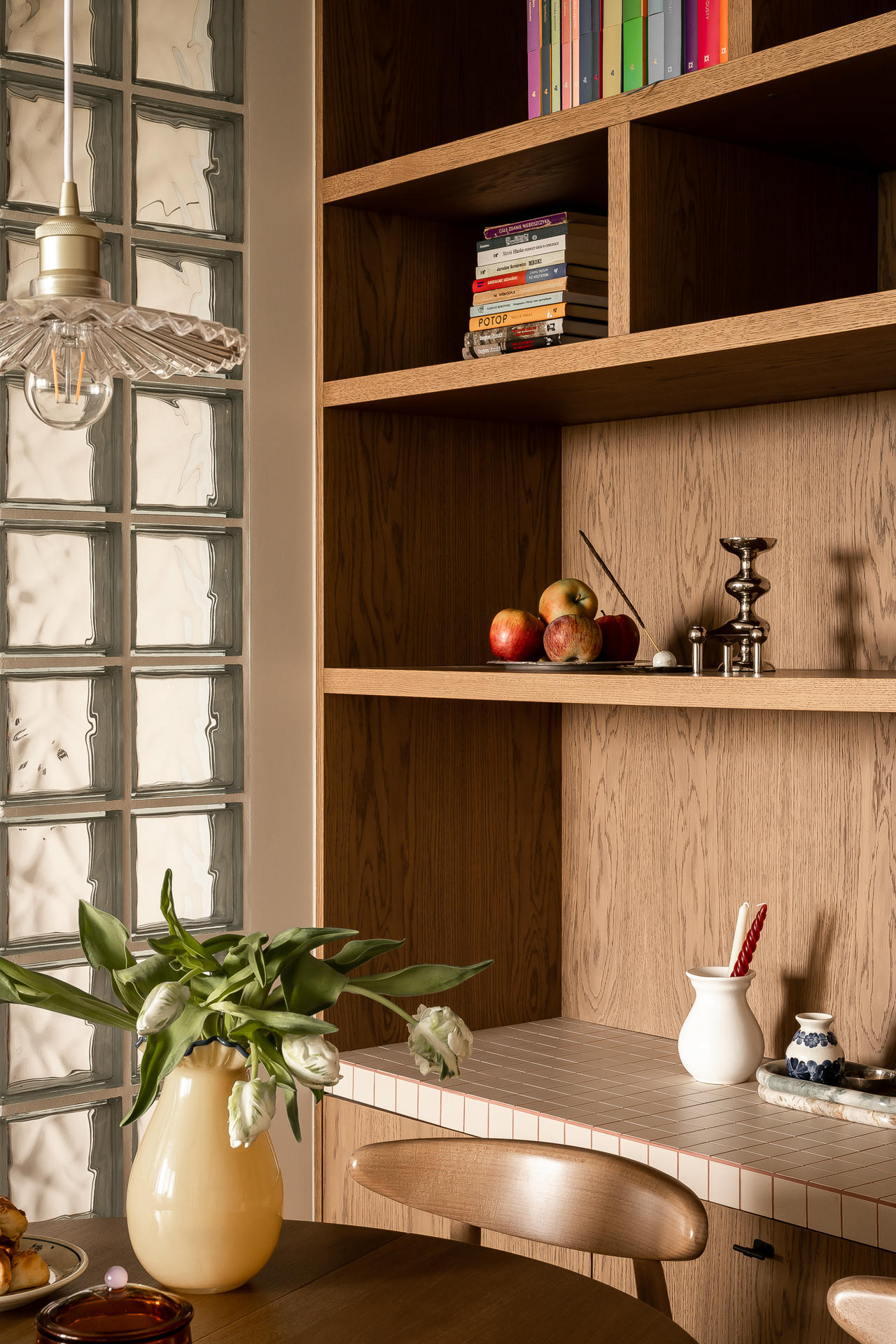 Jedną ze ścian w strefie jadalnianej zdobi drewniany regał, przełamany otwartą półką wykonaną z jasnej mozaiki z ciemniejszą fugą. Ten sam odcień drewna powtarza się w dolnej zabudowie kuchennej, natomiast górne szafki zaprojektowano w jasnej tonacji, aby dodać im lekkości. Całość uzupełniają białe płytki o geometrycznym wzorze oraz zielony kamienny blat.