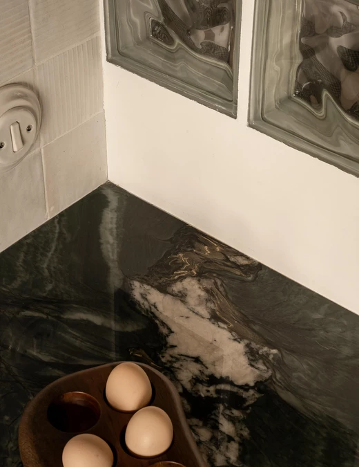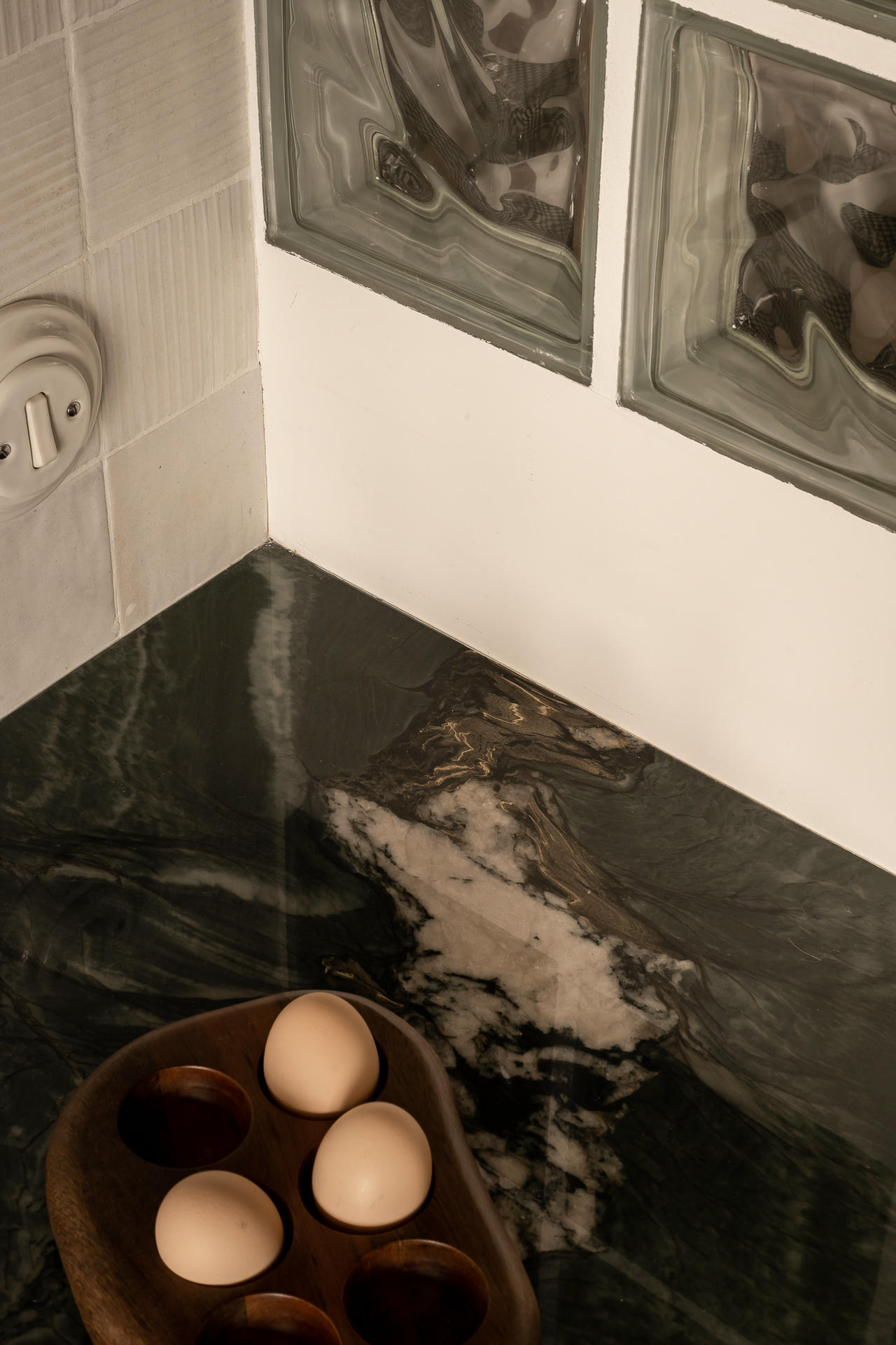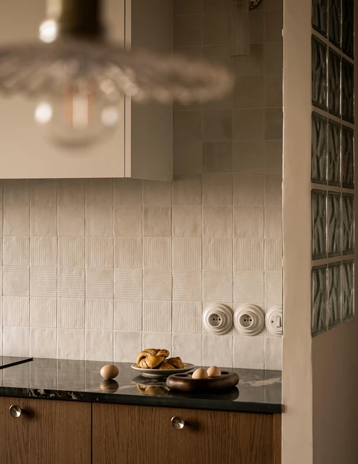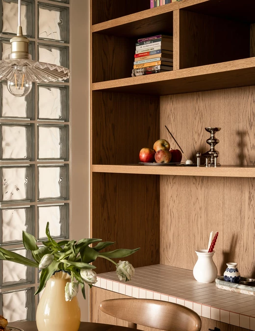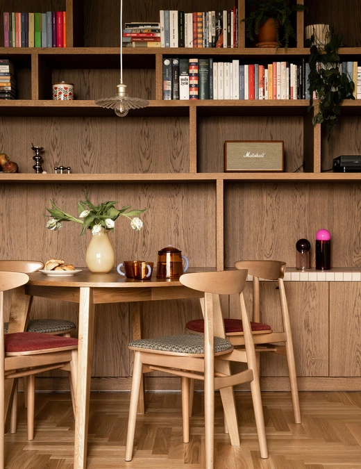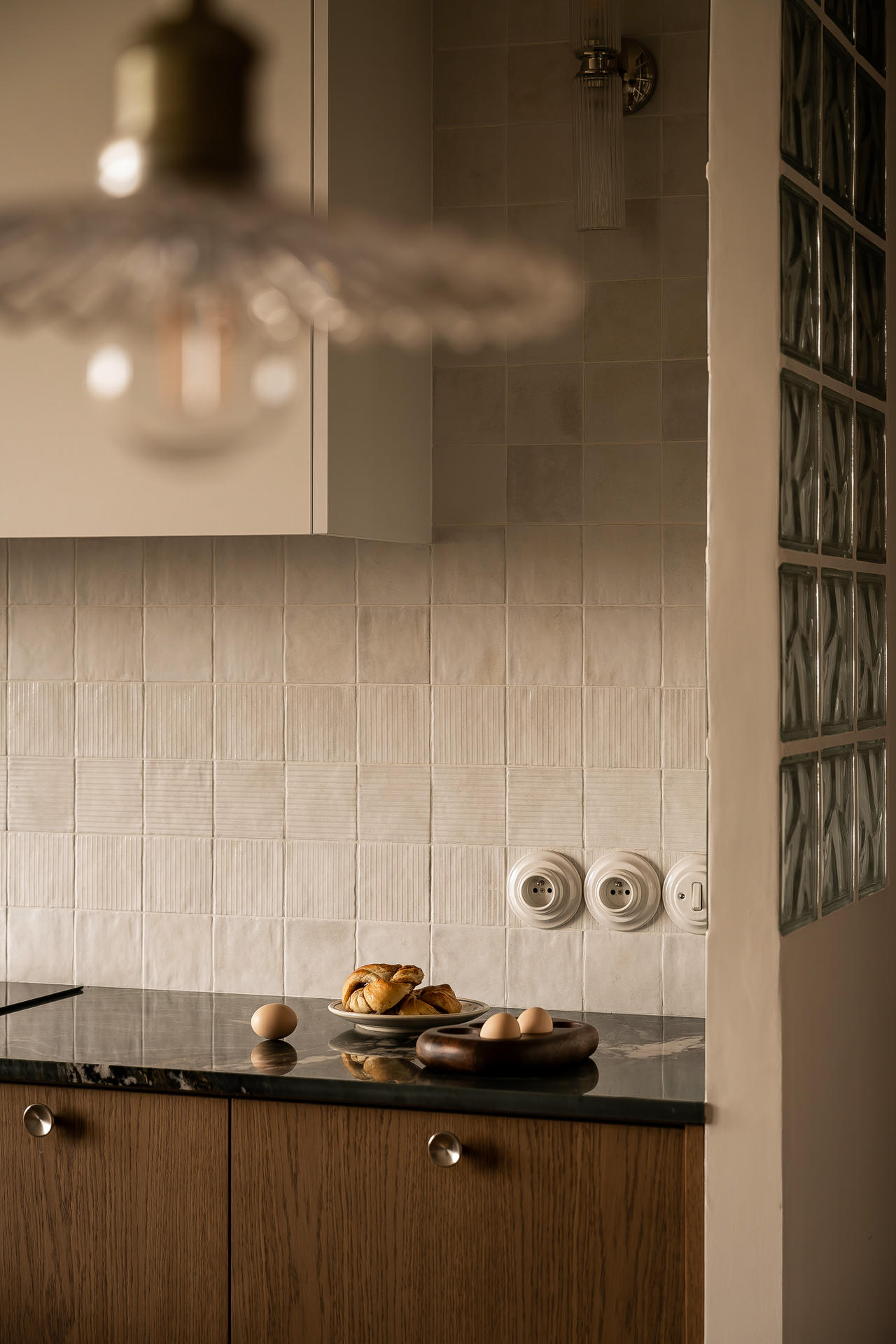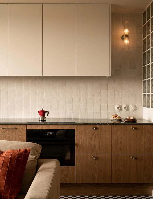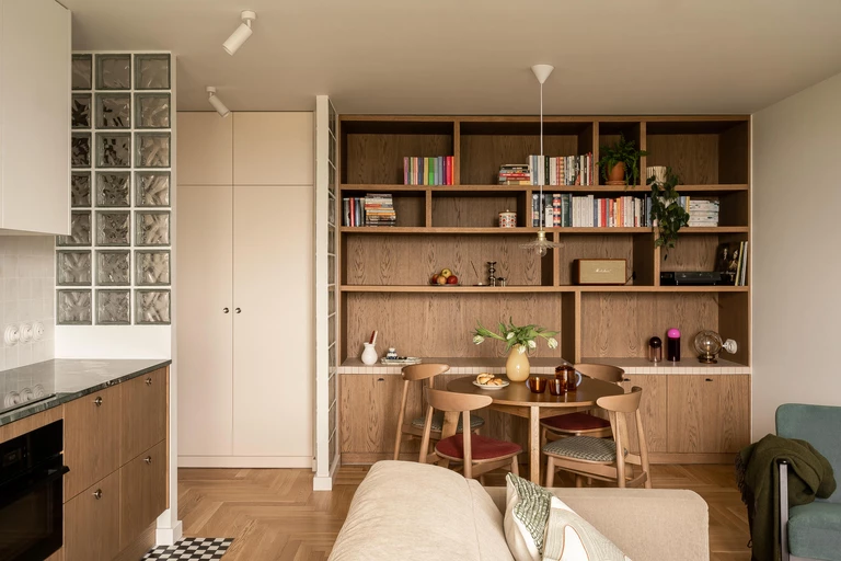 Jedną ze ścian w strefie jadalnianej zdobi drewniany regał, przełamany otwartą półką wykonaną z jasnej mozaiki z ciemniejszą fugą. Ten sam odcień drewna powtarza się w dolnej zabudowie kuchennej, natomiast górne szafki zaprojektowano w jasnej tonacji, aby dodać im lekkości. Całość uzupełniają białe płytki o geometrycznym wzorze oraz zielony kamienny blat.